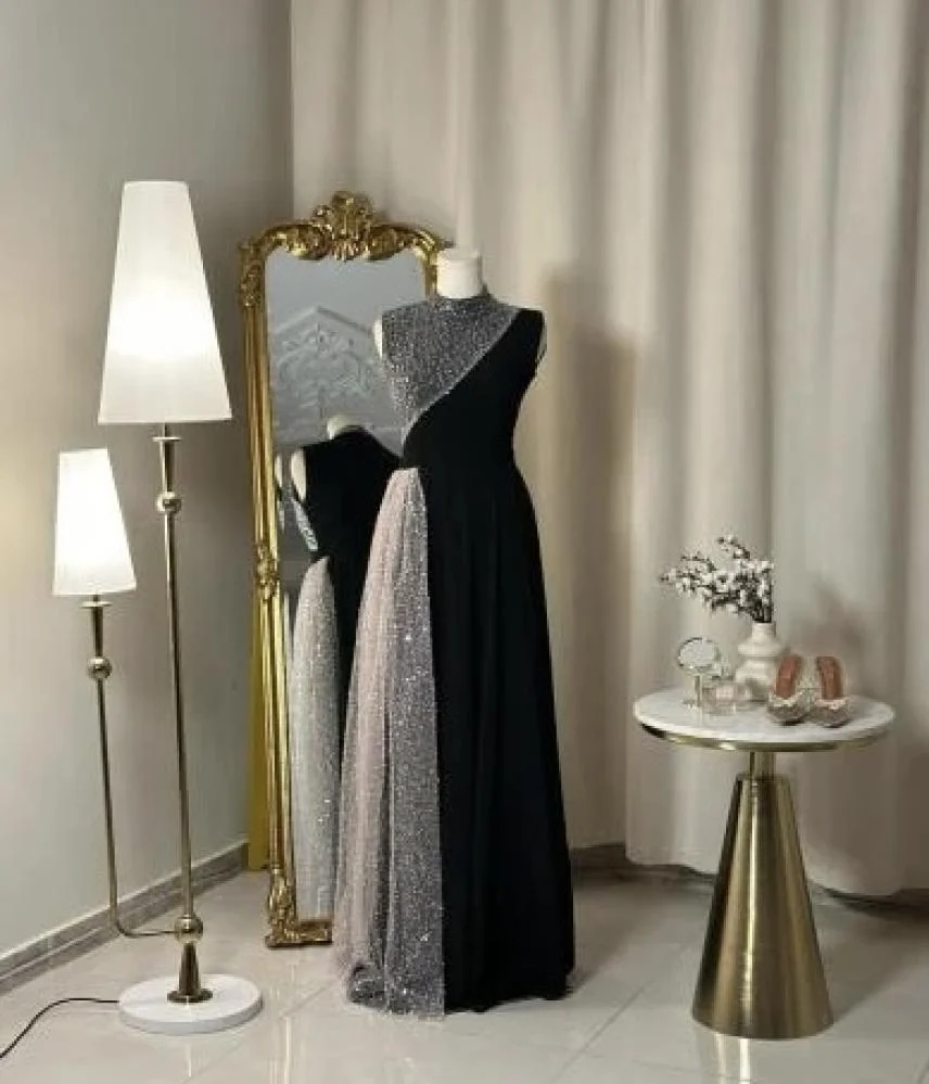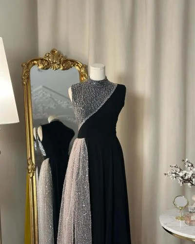 Schwarzes, hochgeschlossenes, ärmelloses A-Linien-Partykleid, lang, MD7488