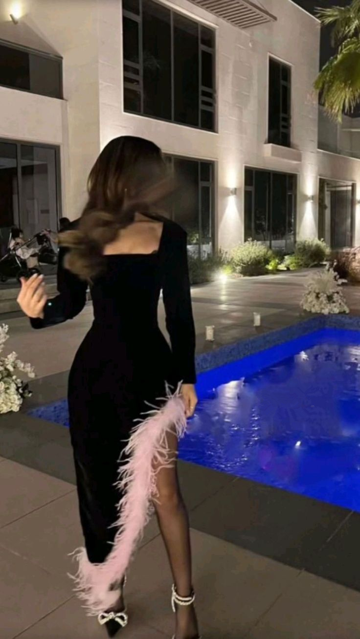 Schwarzes langes Partykleid aus Samt mit langen Ärmeln und Federn MD7508