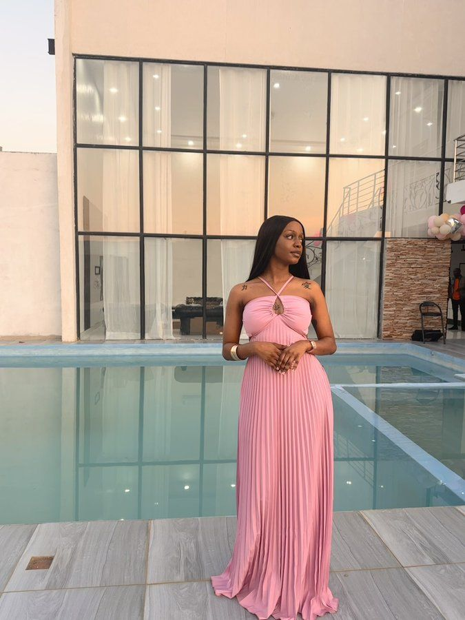 Blaues Neckholder-A-Linien-Partykleid mit offenem Rücken und Plissee-Satin, lang, MD7318