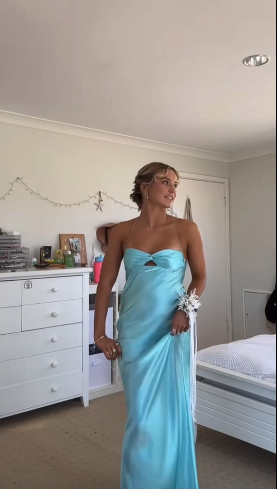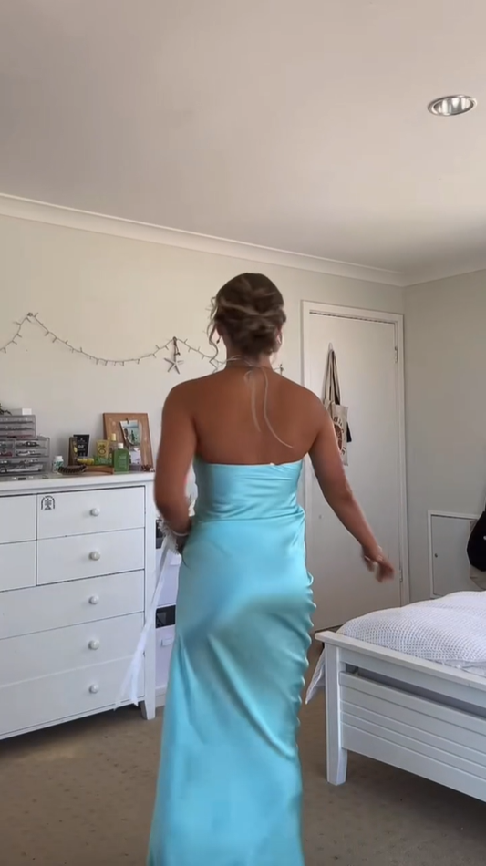 Blaues Neckholder-Etuikleid aus Satin, langes Partykleid für Hochzeitsgäste, D446