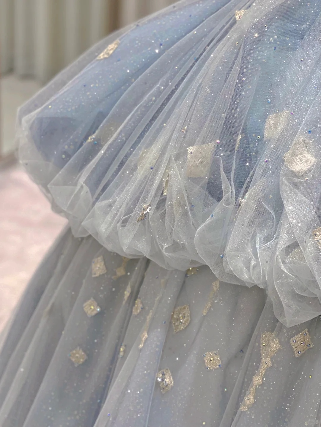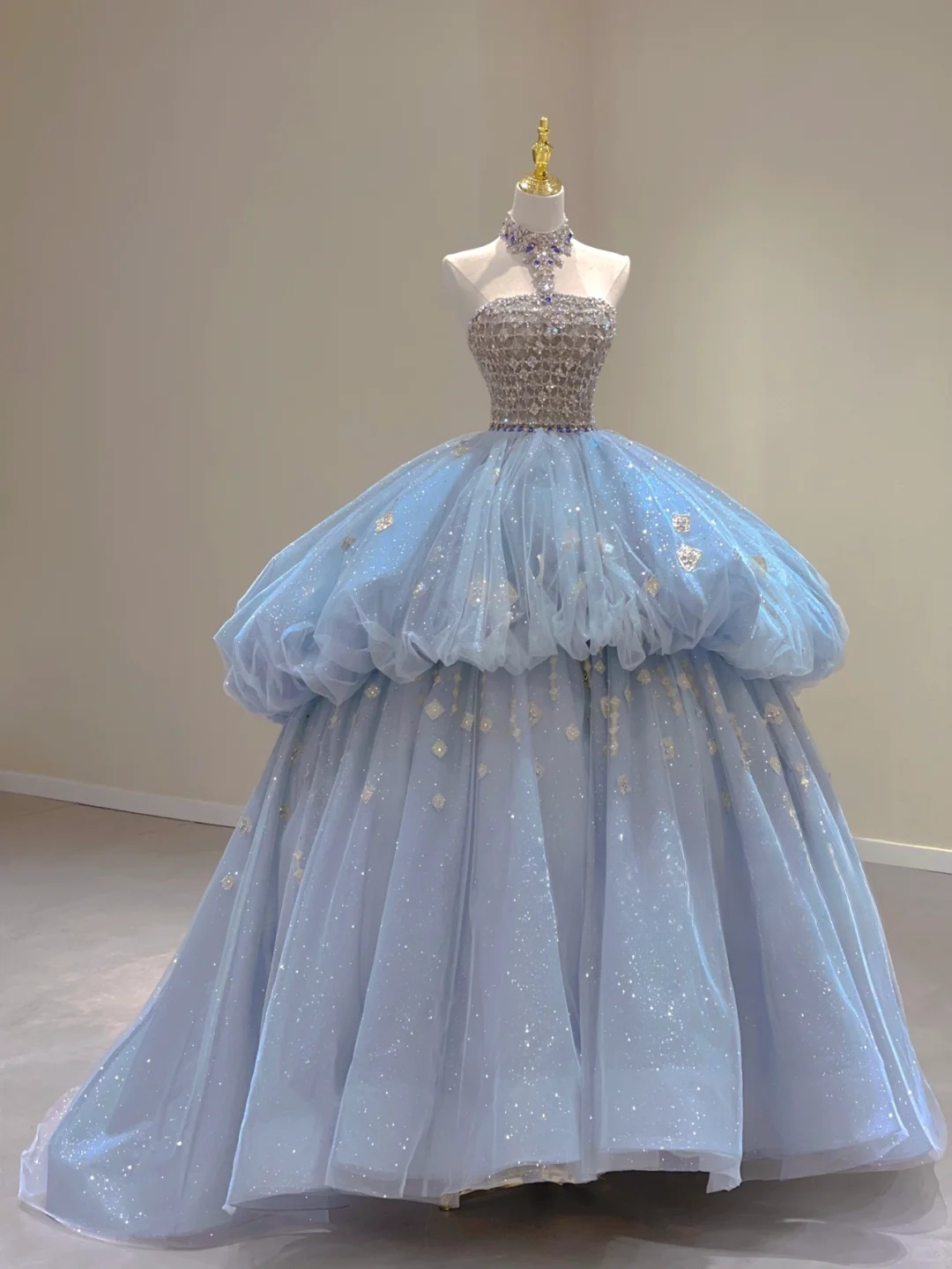 Blaues Neckholder-Ballkleid mit trägerlosem A-Linien-Ausschnitt, süßes 16. Geburtstags-Ballkleid, wunderschönes Abschlussballkleid, D458
