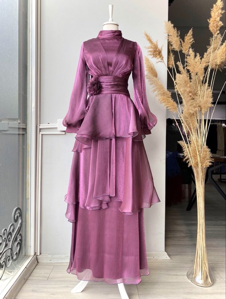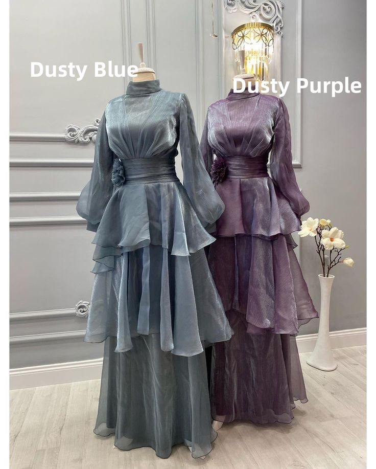 Blaues, hochgeschlossenes, langärmliges A-Linien-Chiffon-Kleid mit schlichtem, langem, formellem Partykleid, D795
