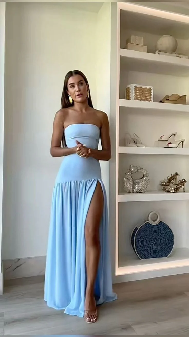 Blaues trägerloses A-Linien-Split-langes Partykleid für Hochzeitsgäste, D484