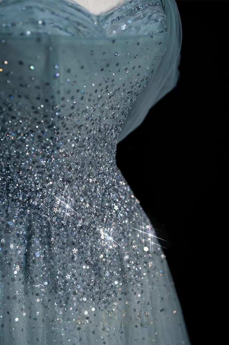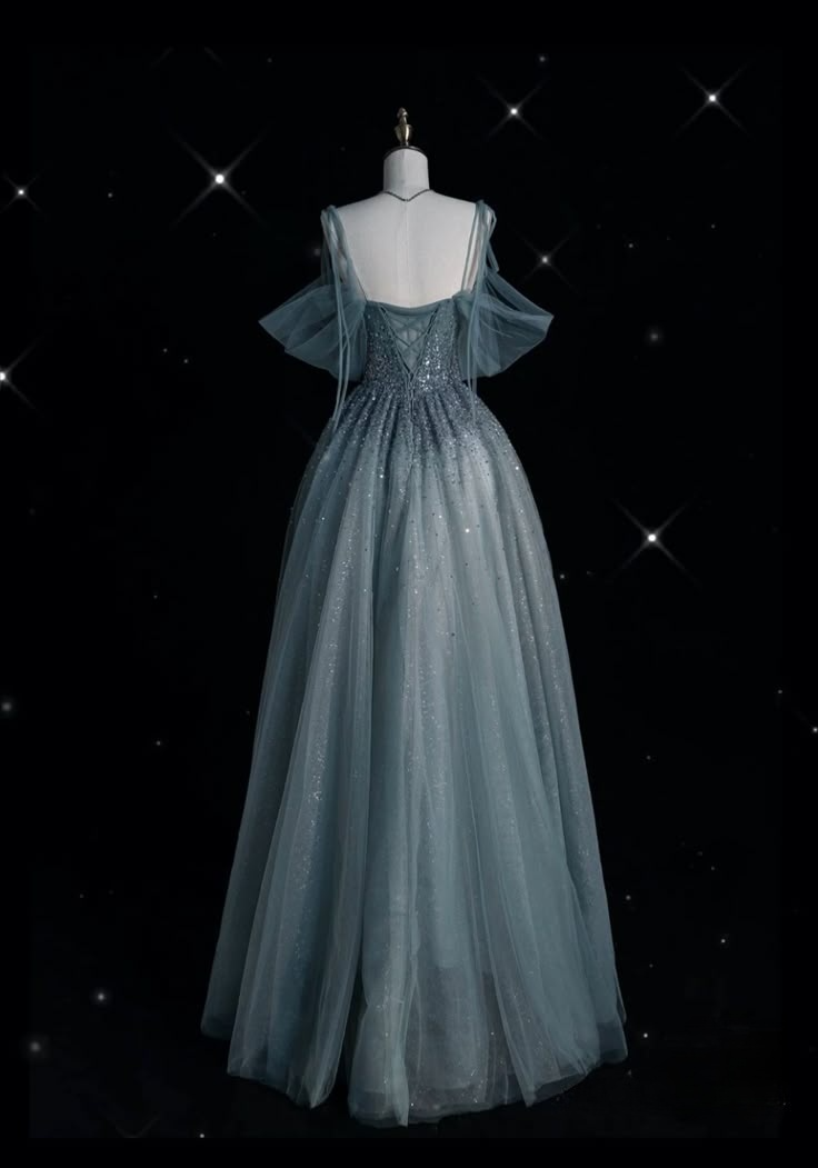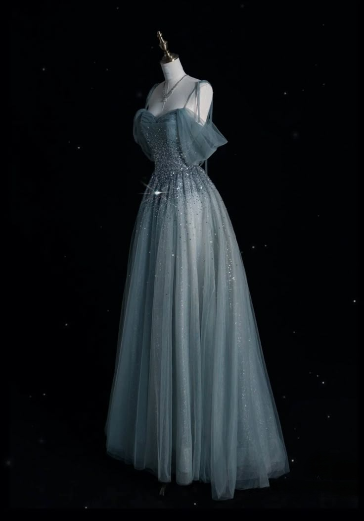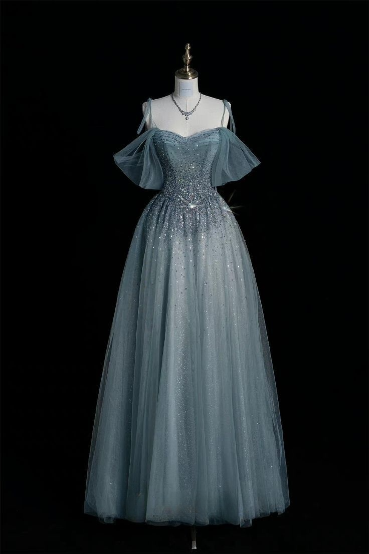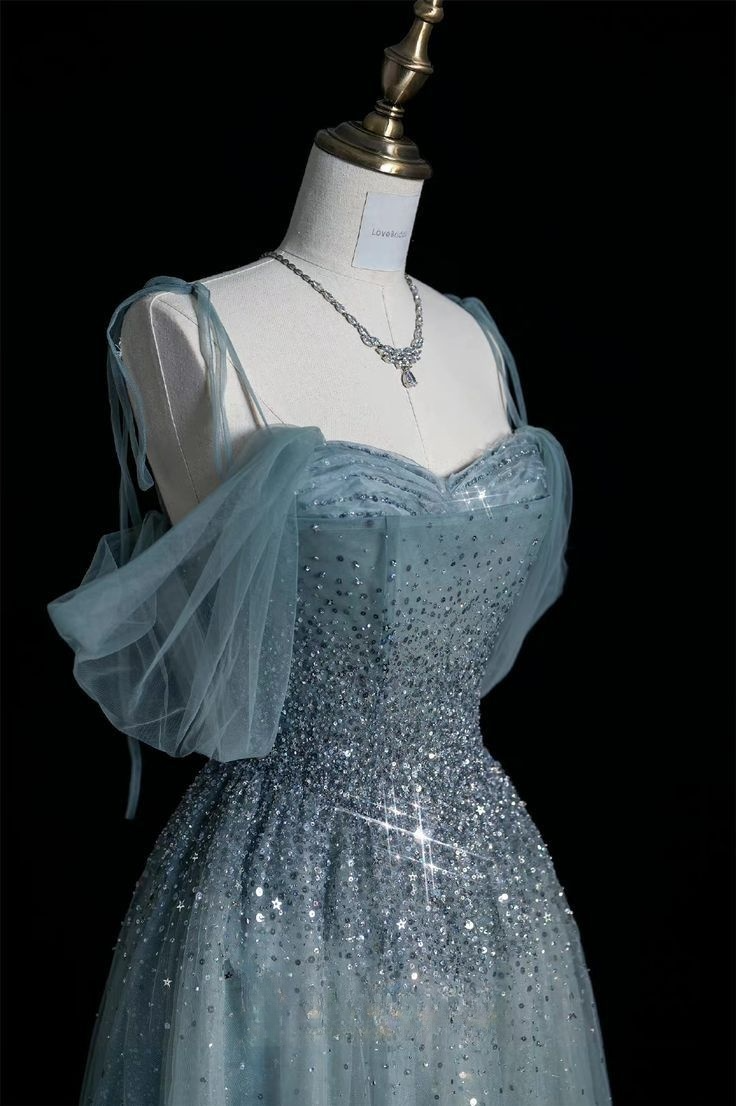 Blaue Träger Off Shoulder A-Linie Tüll Perlen Langes formelles Abendkleid Partykleid, D1100