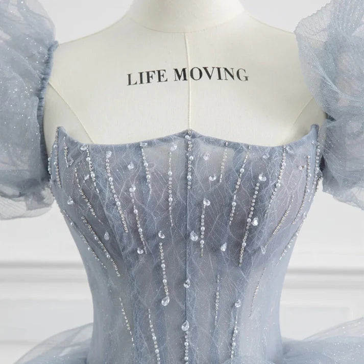 Blaues Tüll-Prinzessin-Ballkleid mit Puffärmeln, süßes Abendkleid MD7547