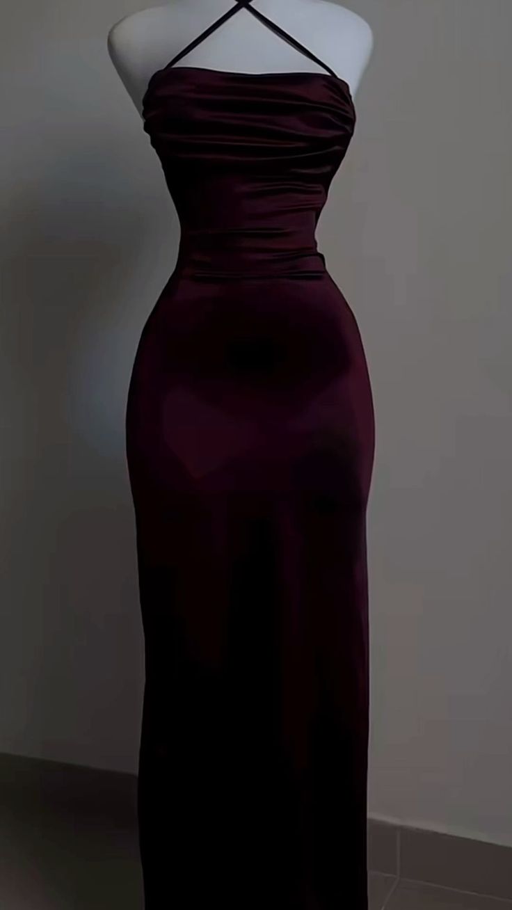 Burgunderrotes, rückenfreies Etuikleid aus Satin mit Trägern, schlichtes, langes Abendkleid, D304