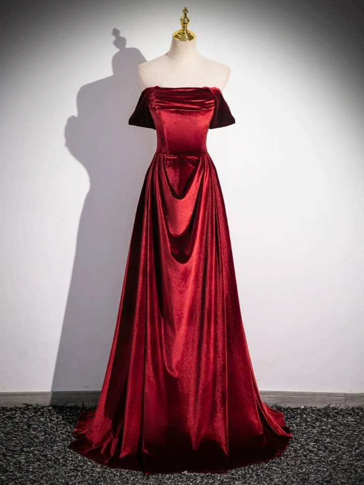 Elegantes, schulterfreies A-Linien-Partykleid aus burgunderrotem Samt MD7184