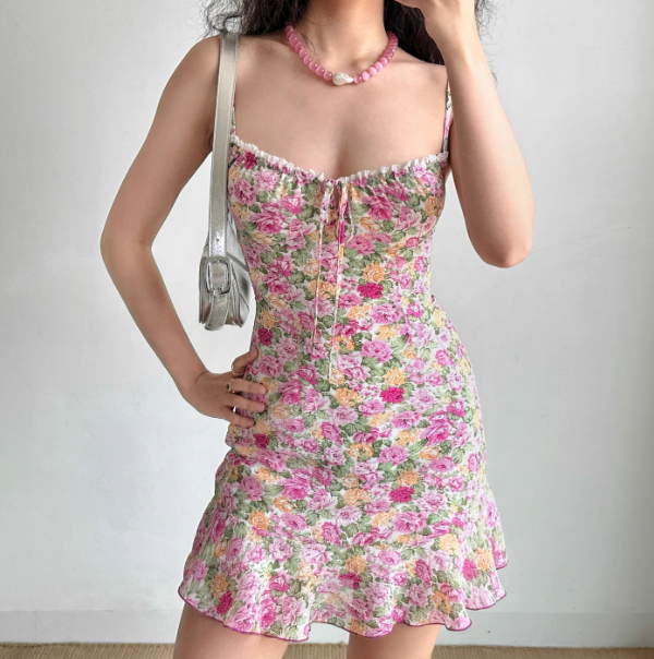 Charmante Spaghettiträger mit Schnürung, Blumenmuster, kurzer Rock, für Teenager, Mädchen, Frauen, Sommer, Date-Kleid, Meerkleid D2188