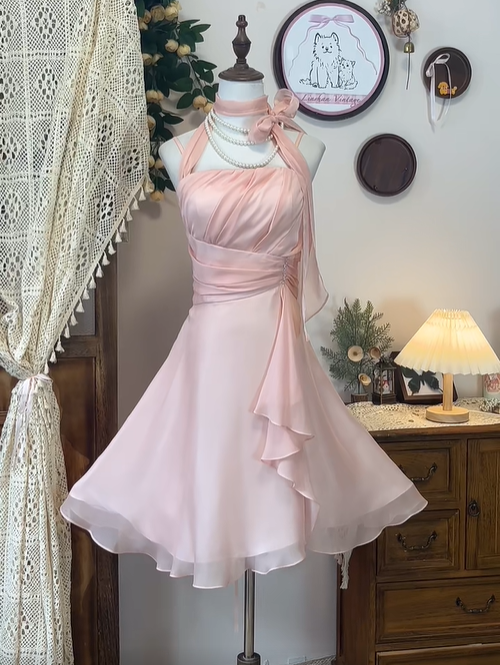 Süßes, rüschenbesetztes, rosa Neckholder-Empire-Kleid für Sweet 16 Partykleid D1744