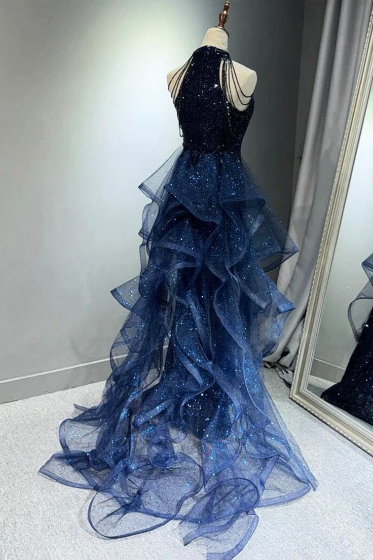 Dunkelmarineblaues Neckholder-Meerjungfrauenkleid mit Pailletten, langes formelles Partykleid, Abendkleid, D851