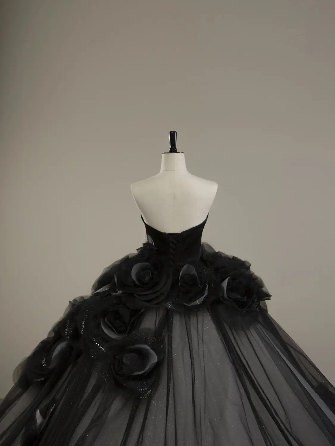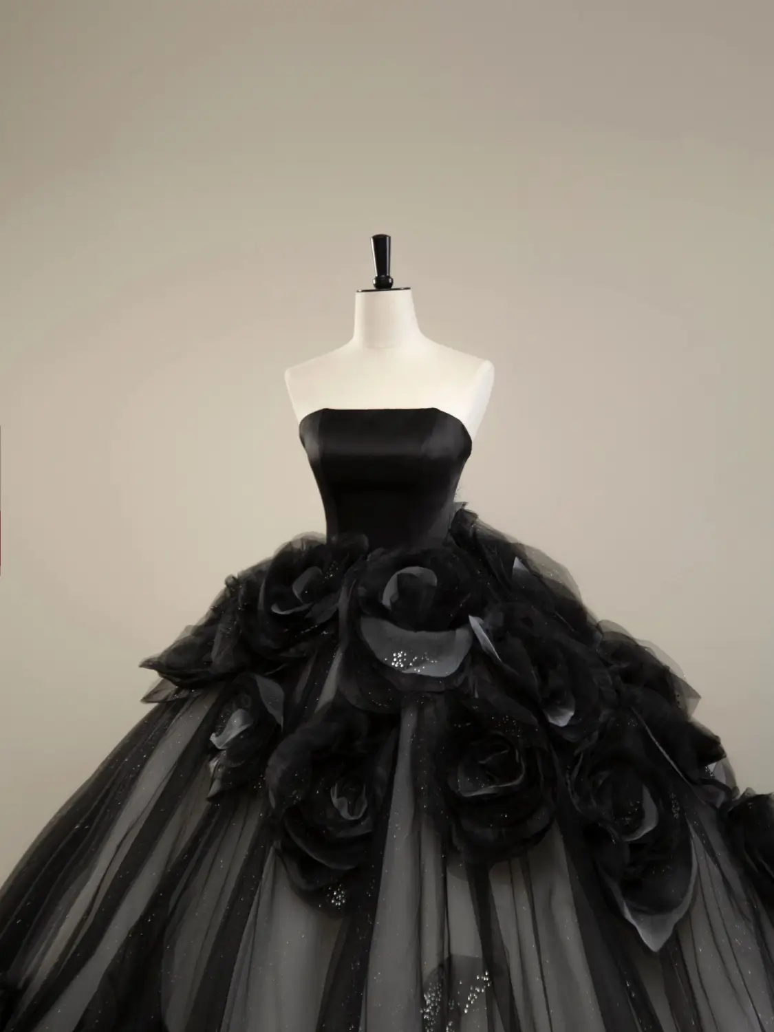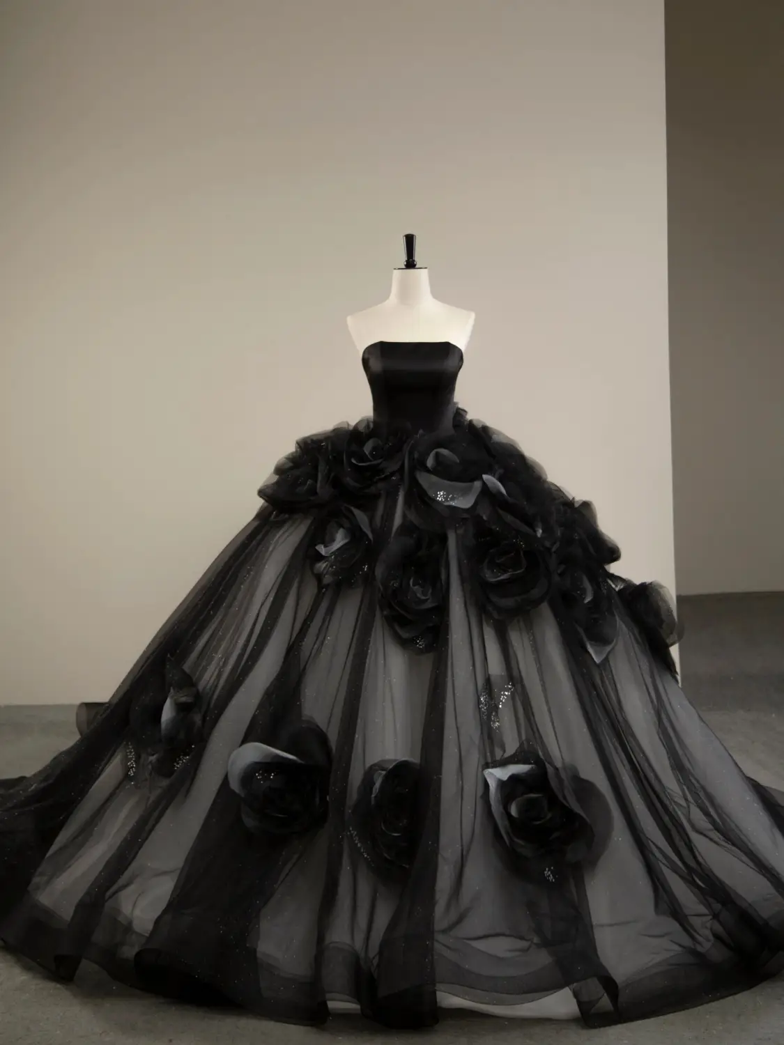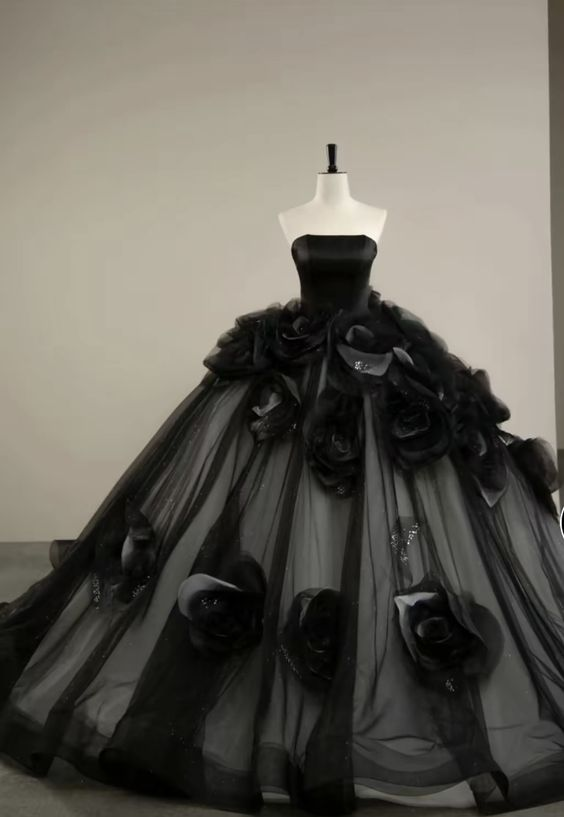 Elegantes schwarzes trägerloses Quinceanera-Kleid mit Blumenmuster, Abend- und Ballkleid MD7443