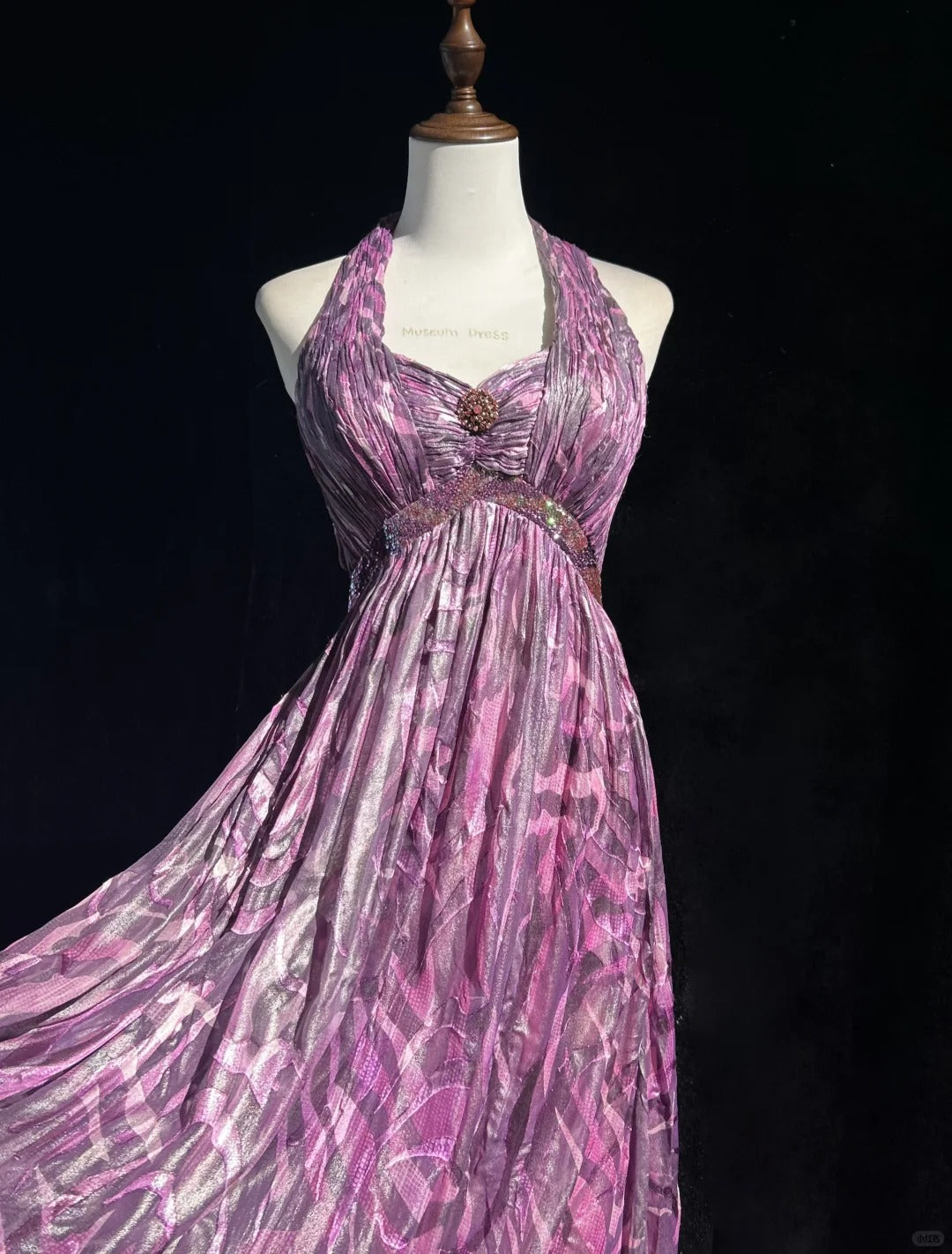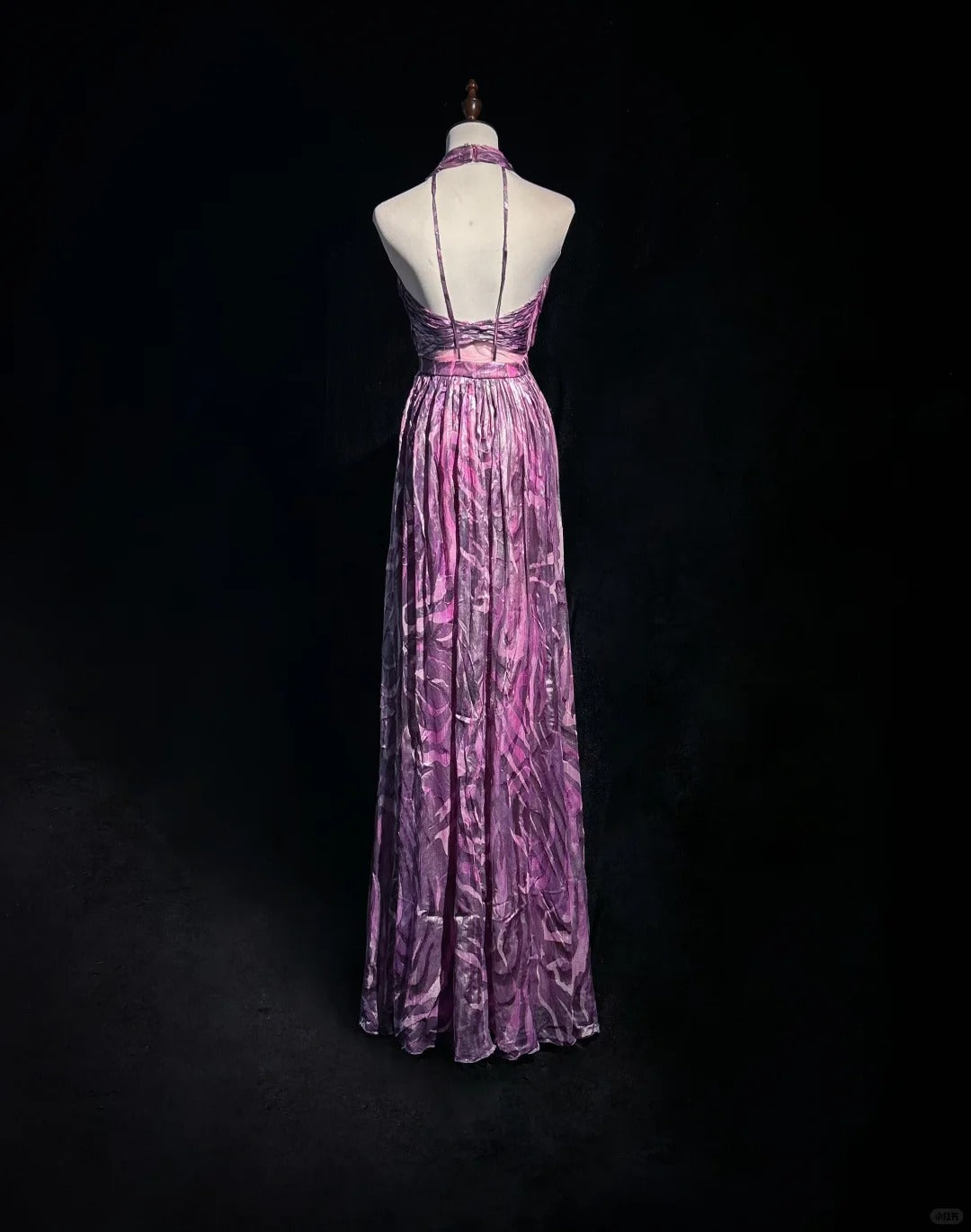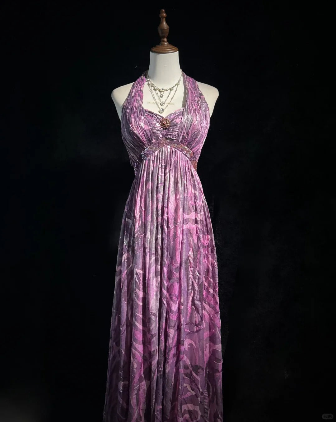 Elegantes Neckholder Plissee Print Rückenfreies Ballkleid Abendkleid Partykleid D2120