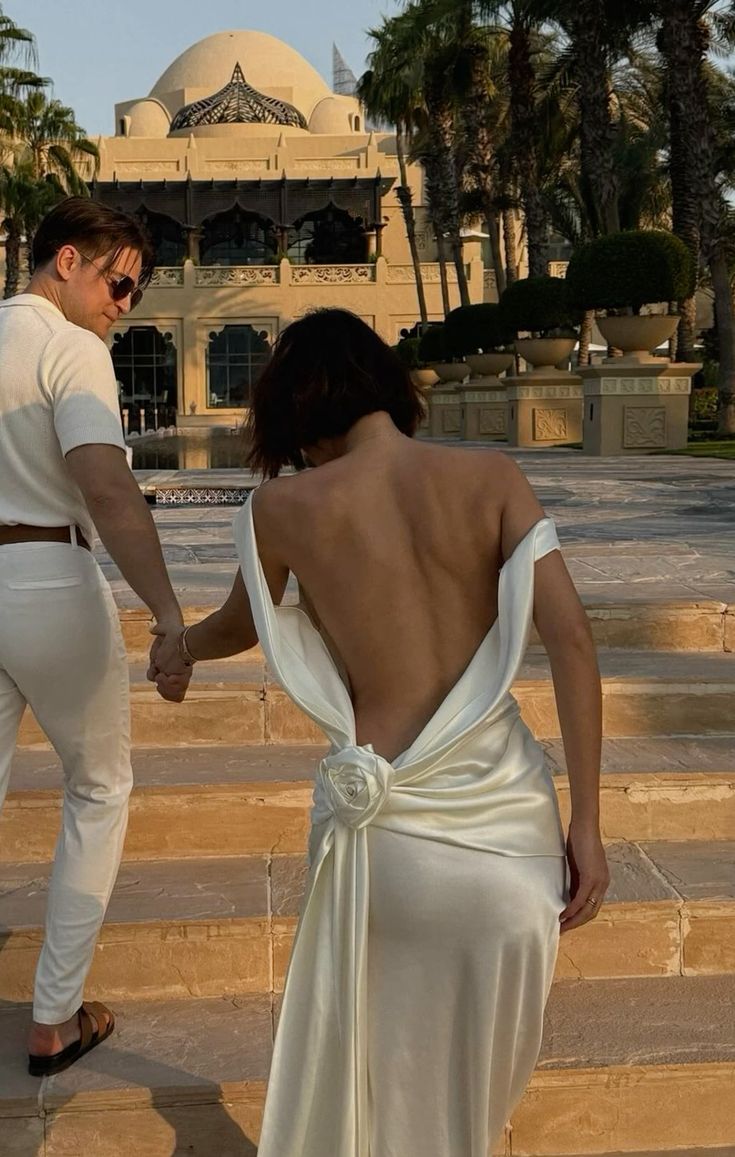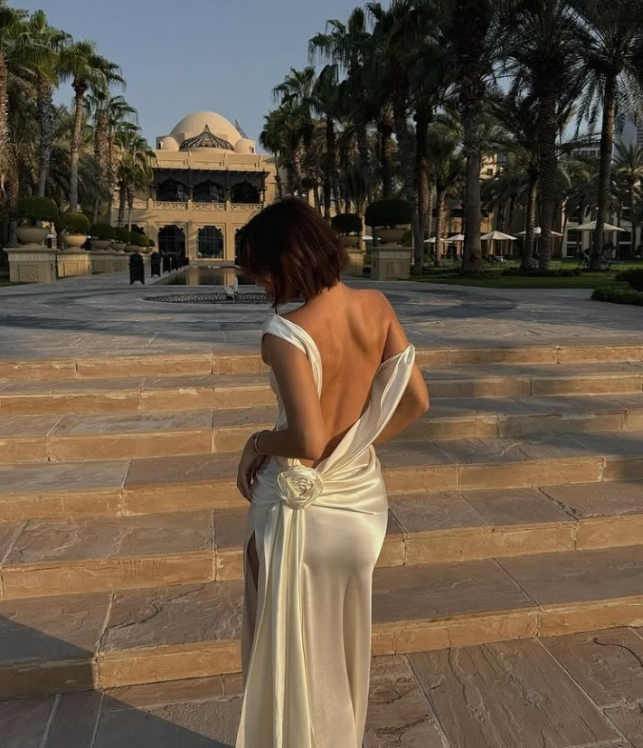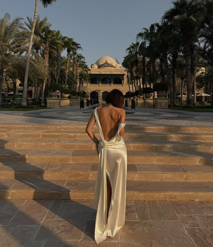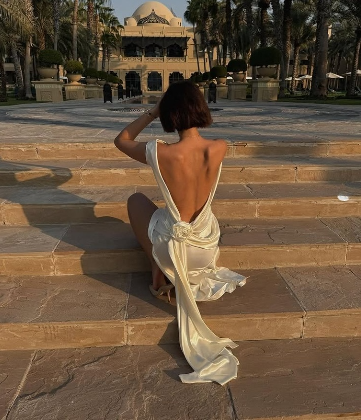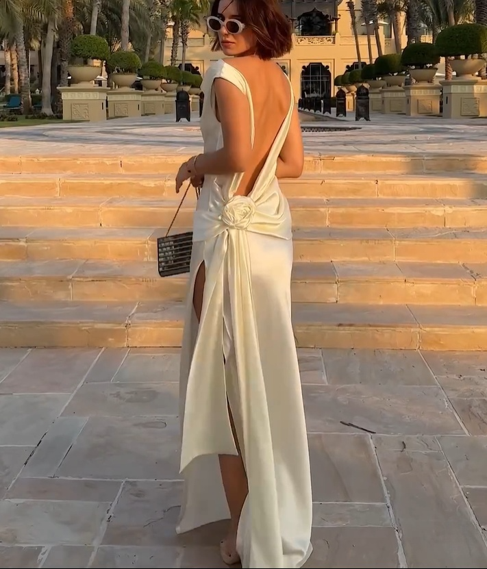 Elegantes rückenfreies Etuikleid aus Satin in Elfenbein, langes Partykleid, leichtes Brautkleid, D500