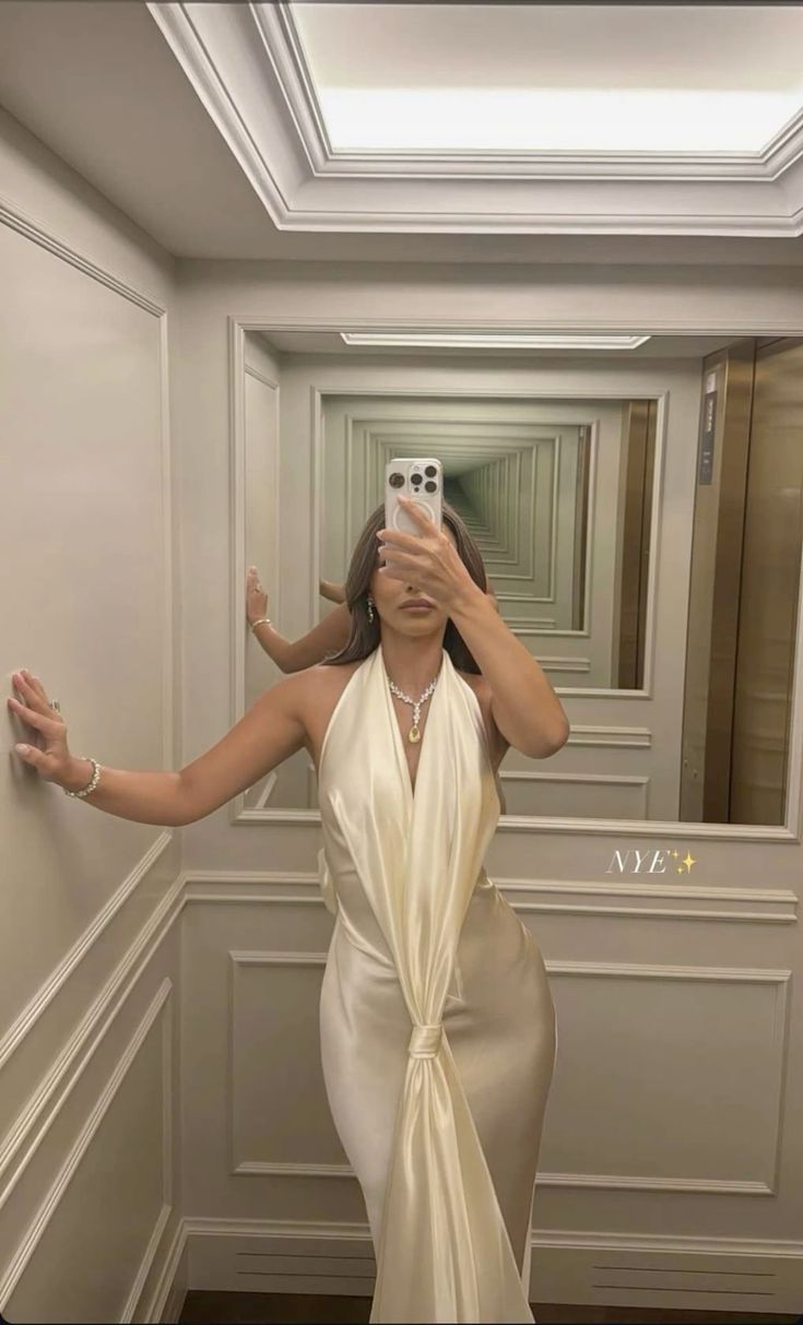 Elegantes, elfenbeinfarbenes Neckholder-Meerjungfrauen-Satin-Abendkleid, langes Partykleid, D506