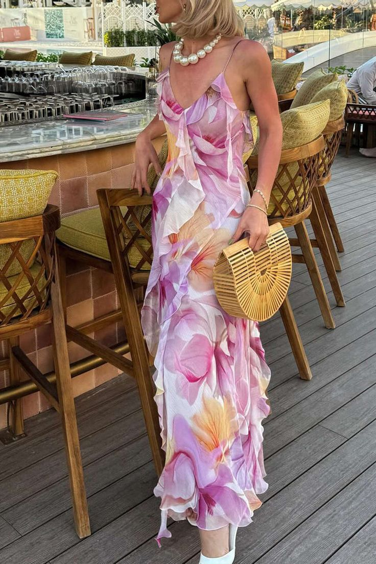 Elegantes, fliederfarbenes, langes Chiffon-Kleid mit Trägern, für Hochzeitsgäste, D559