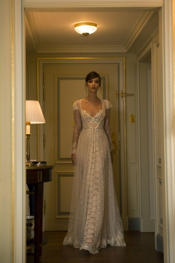 Elegantes Langes Ärmel Weißes A-Linien-Spitzen-Brautkleid, Brautkleid, D955