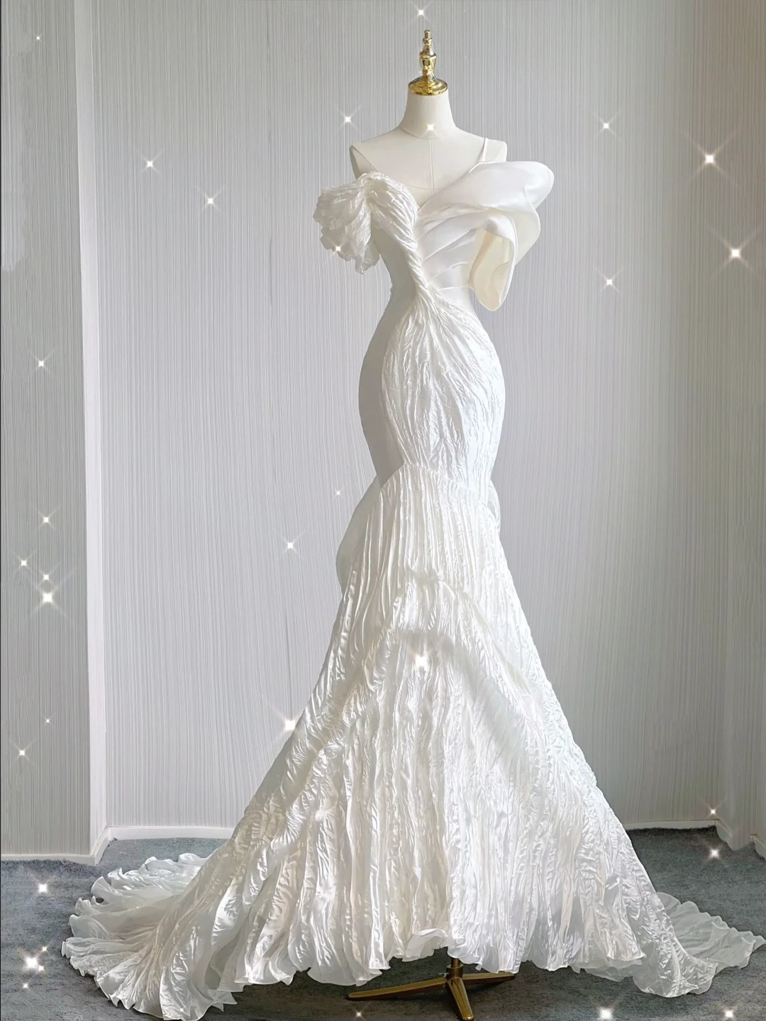 Elegantes weißes schulterfreies Meerjungfrau-Satin-Langkleid, Brautkleid, D478