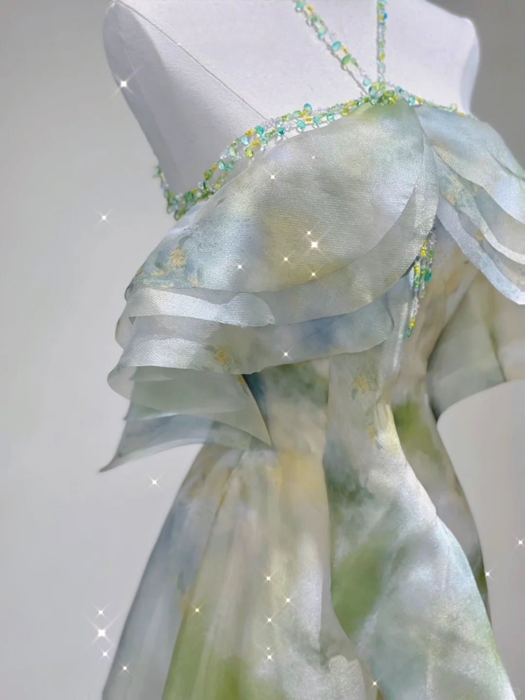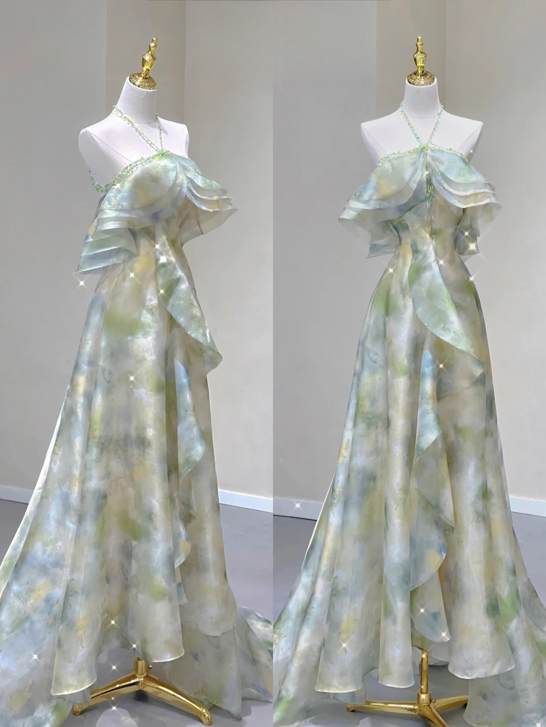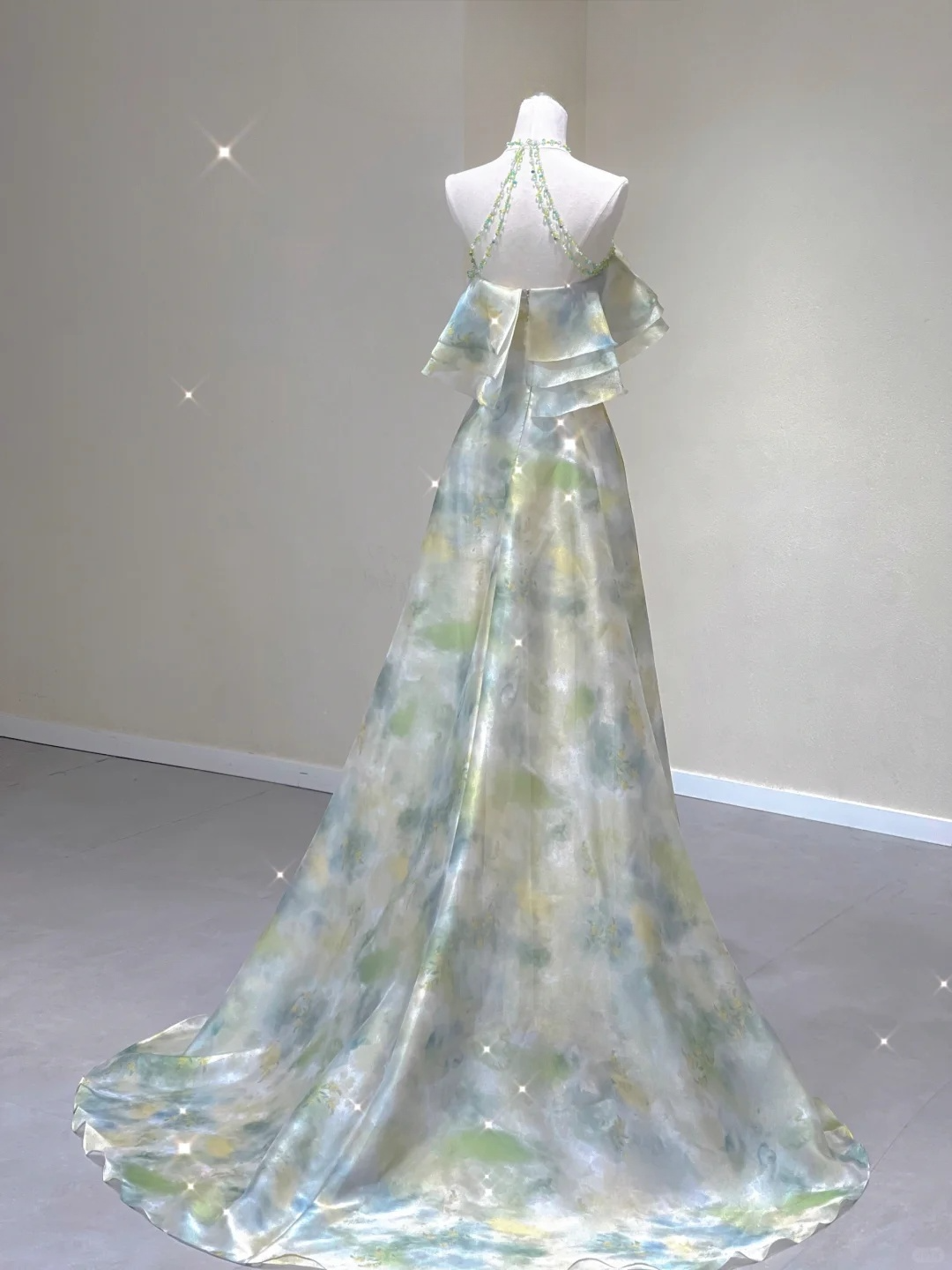 Feengrünes Neckholder-A-Linien-Kleid mit schulterfreiem Schnitt, elegantes langes Partykleid, Geburtstagsoutfits, D456