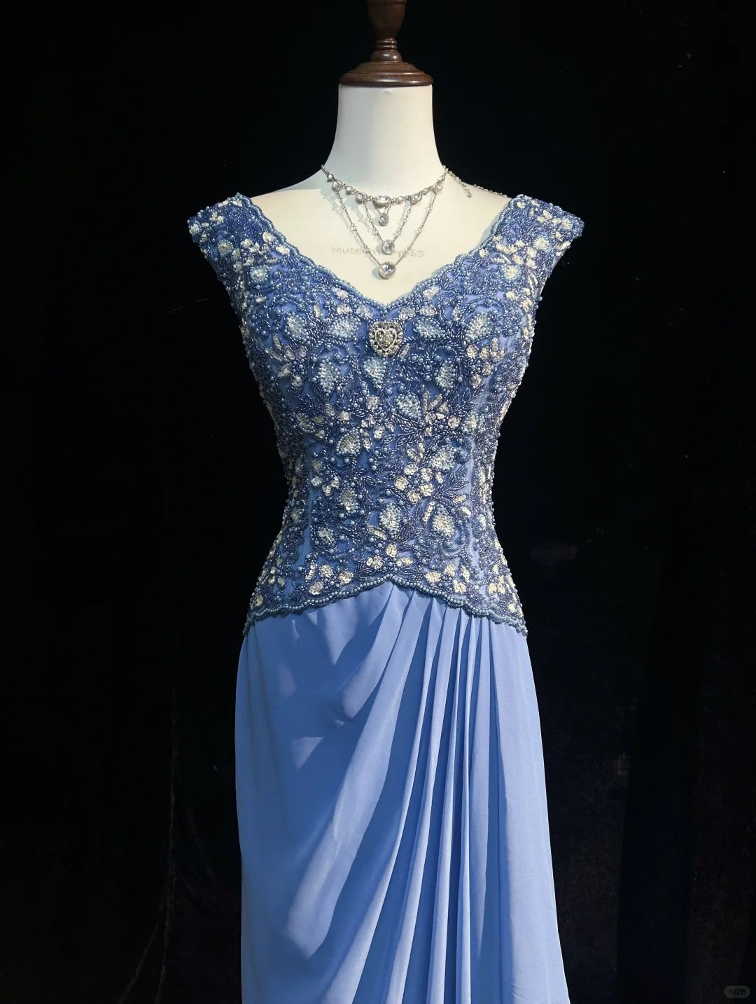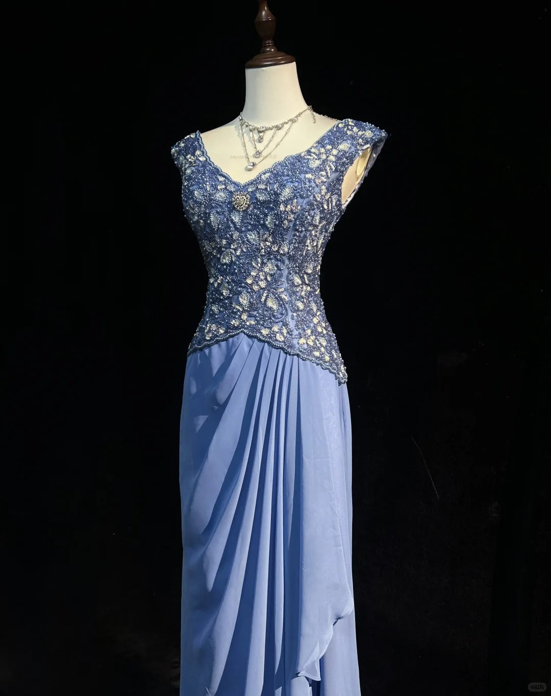 Gergous V-Ausschnitt Perlen Pailletten Plissee Bodenlang Ballkleid Abendkleid Partykleid D2125