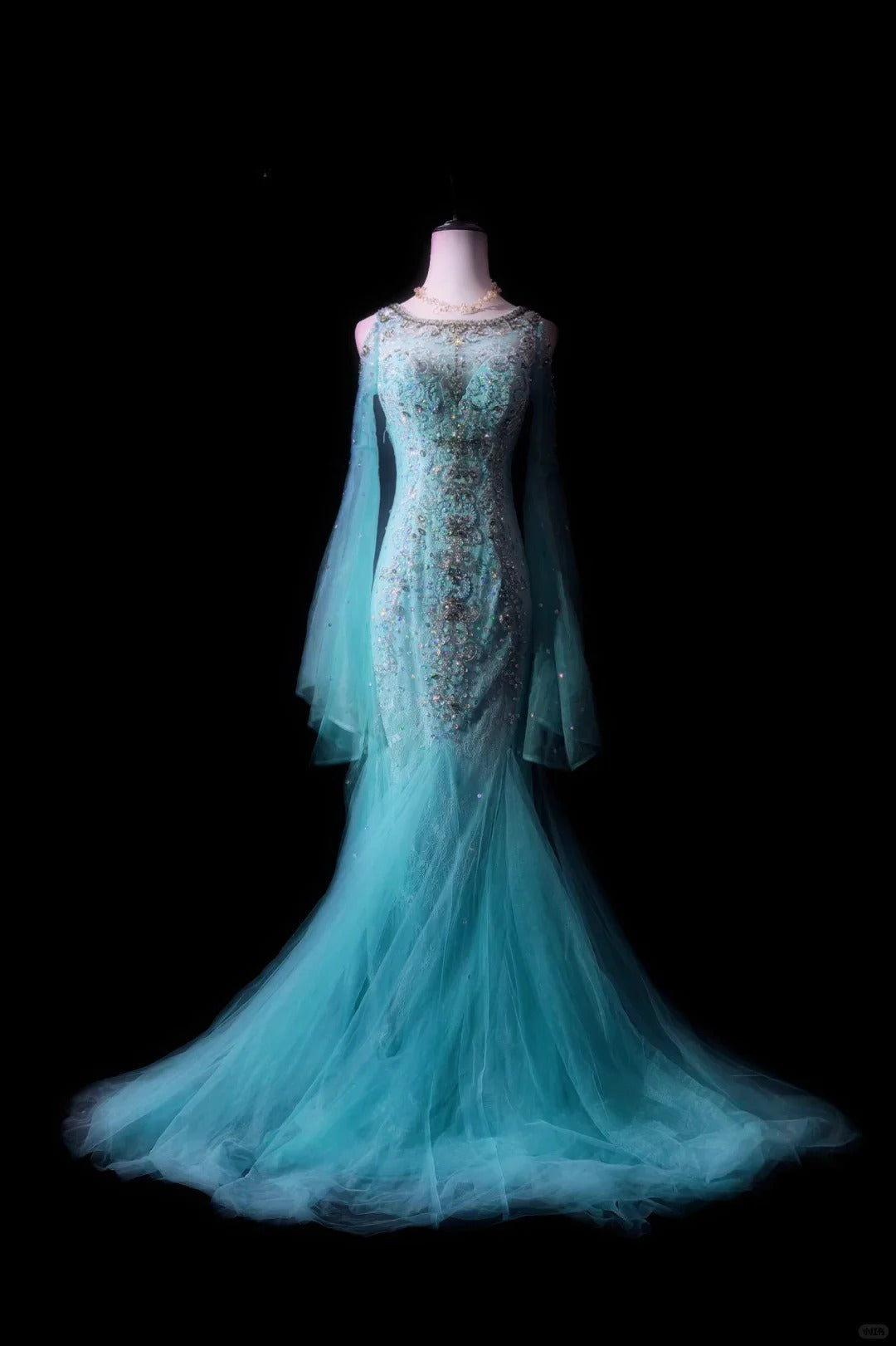 Wunderschönes, langärmliges Partykleid mit Rundhalsausschnitt, Pailletten, Spitze, Kristall, mehrstufiges Tüllkleid, Abendkleid, Meerjungfrauenkleid, Ballkleid D1881