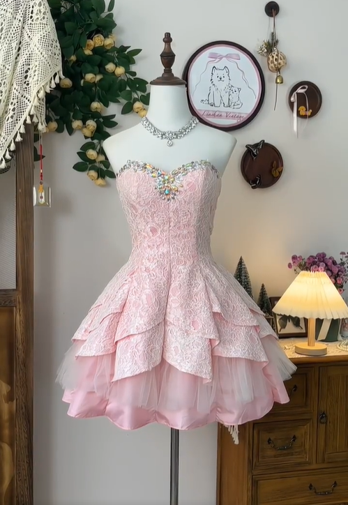 Wunderschönes kurzes Ballkleid mit Herzausschnitt und Swarovski-Kristallen, Spitze, gestuftem Volant und Quinceanera-Kleid D1761