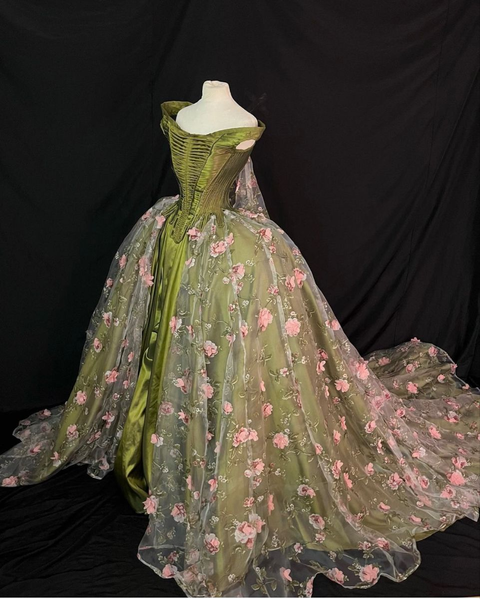 Grünes schulterfreies A-Linien-Abendkleid mit Satinspitze, langes Ballkleid, D752