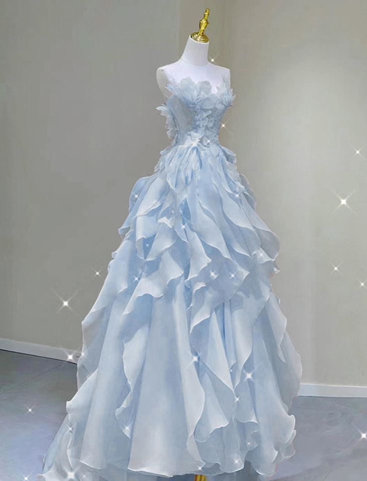 Hellblaues trägerloses A-Linien-Chiffon-Partykleid mit langen Ärmeln, Geburtstags-Outfits MD7417