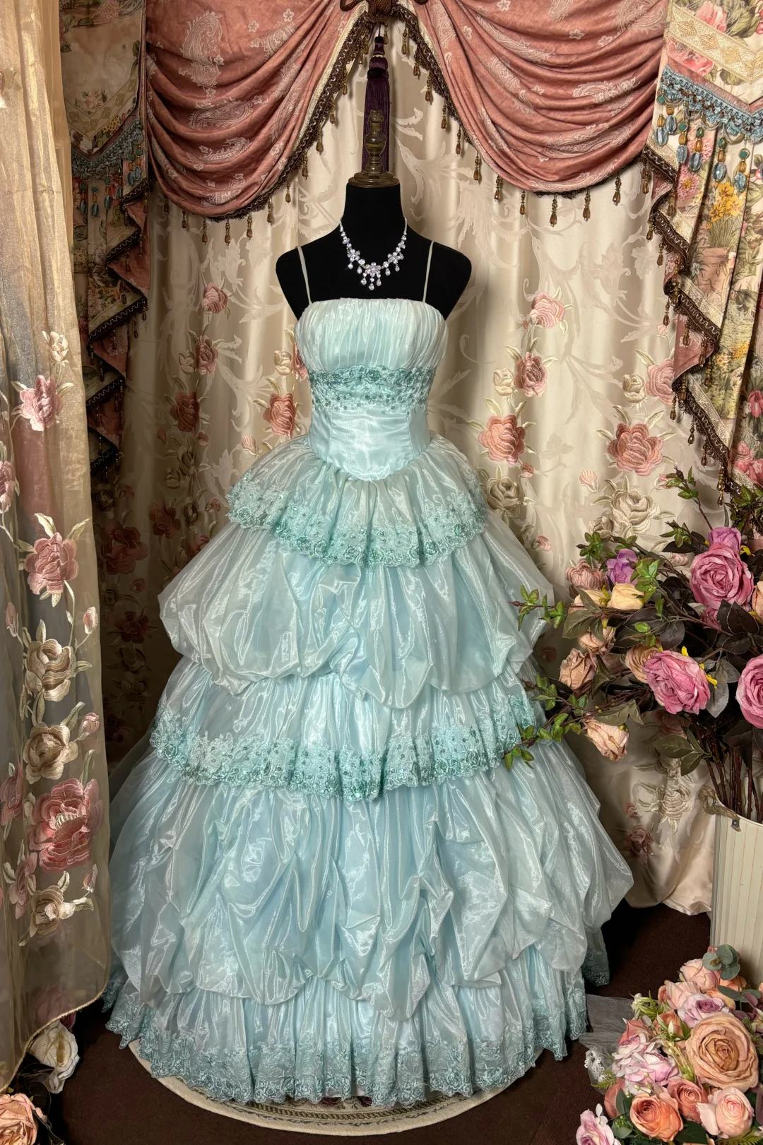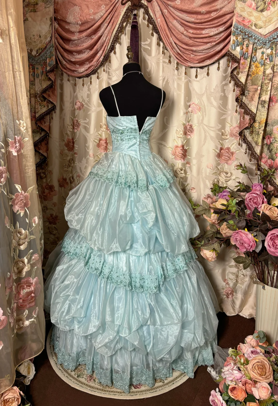 Hellblaue Träger A-Linie Organza Spitze Fee Langes Partykleid Geburtstagsballkleid, D634