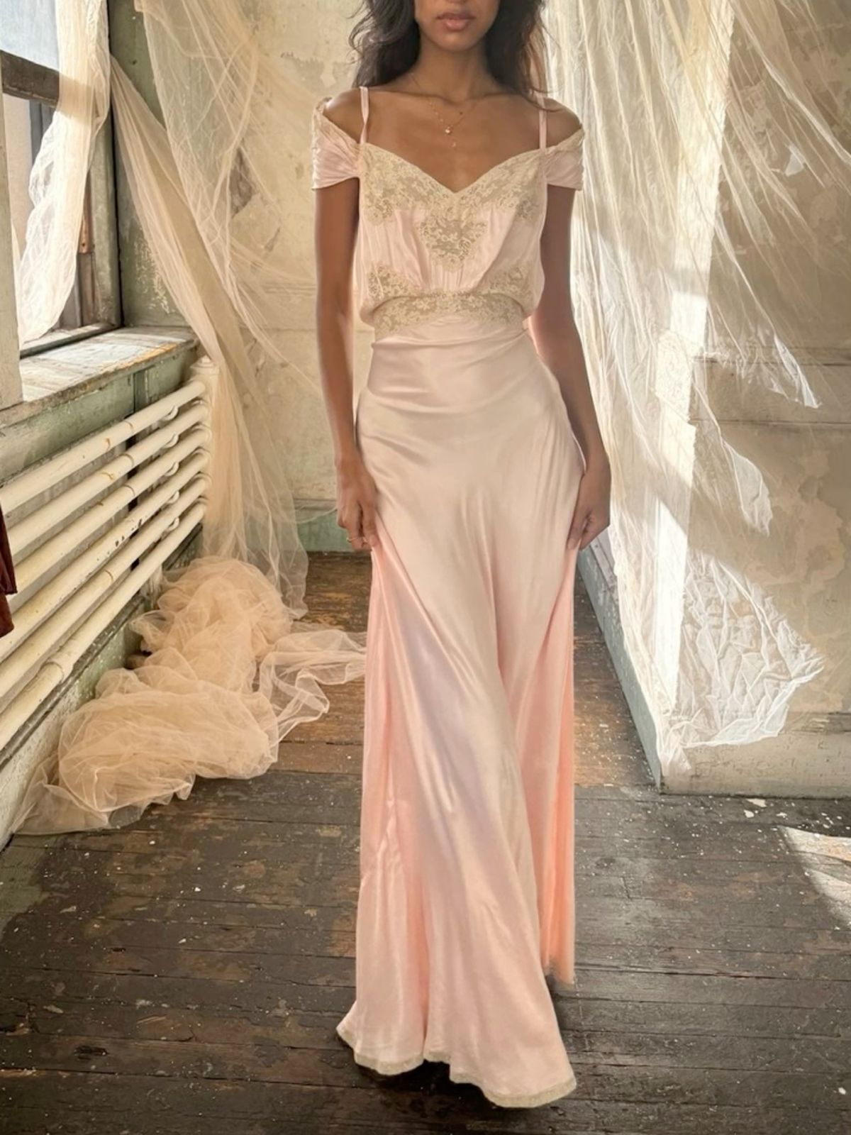 Hellrosa schulterfreies A-Linien-Vintage-Abendkleid mit langen Trägern, D1170