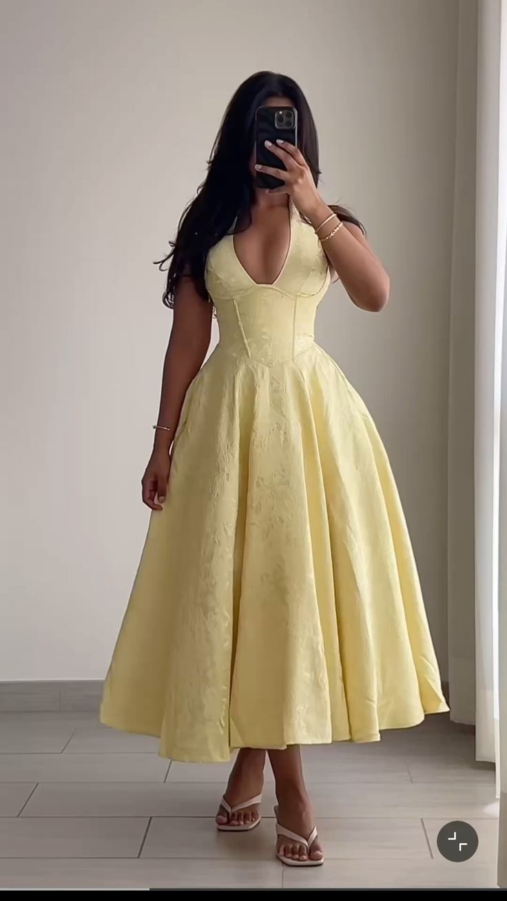 Hellgelbes V-Ausschnitt Neckholder A-Linie Langes Partykleid Hochzeitsgastkleid, D547