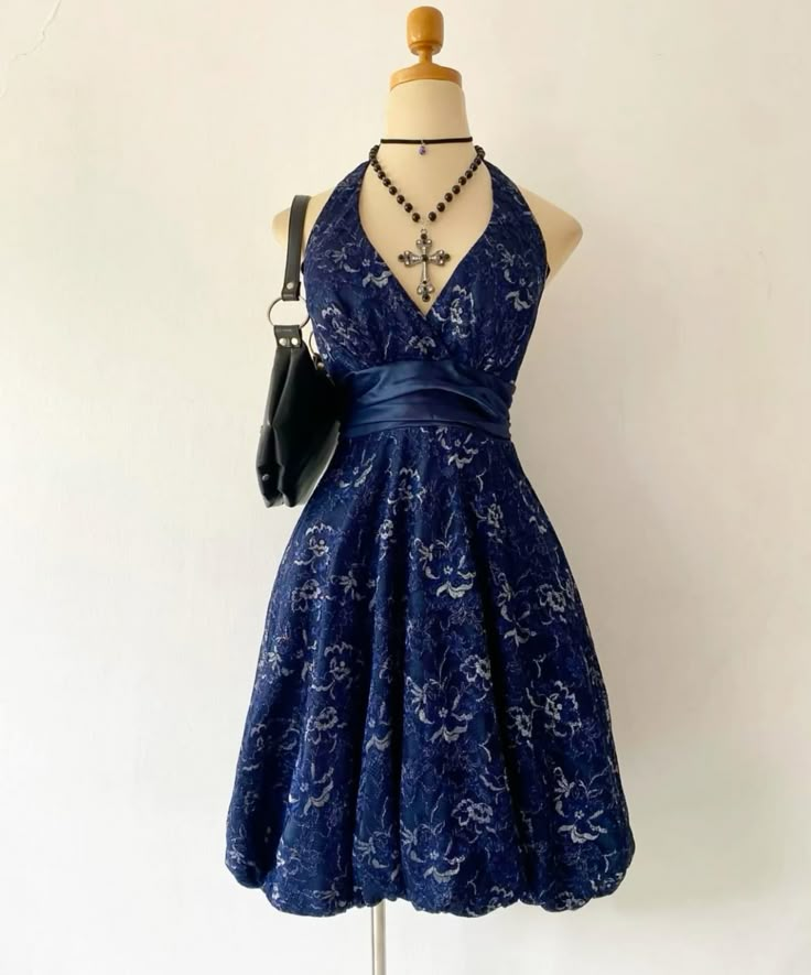 Marineblau Neckholder A-Linie Spitze Midi Länge Partykleider Cocktailkleider, D1221