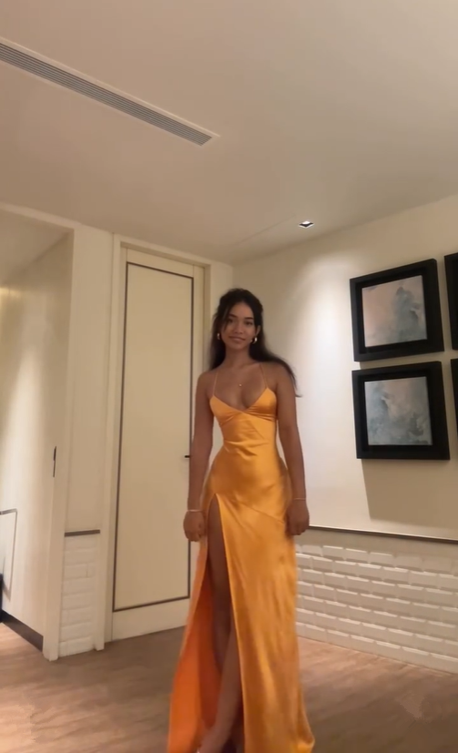 Orange V-Ausschnitt Träger Etuikleid Satin Langes Partykleid Hochzeitsgastkleid, D445