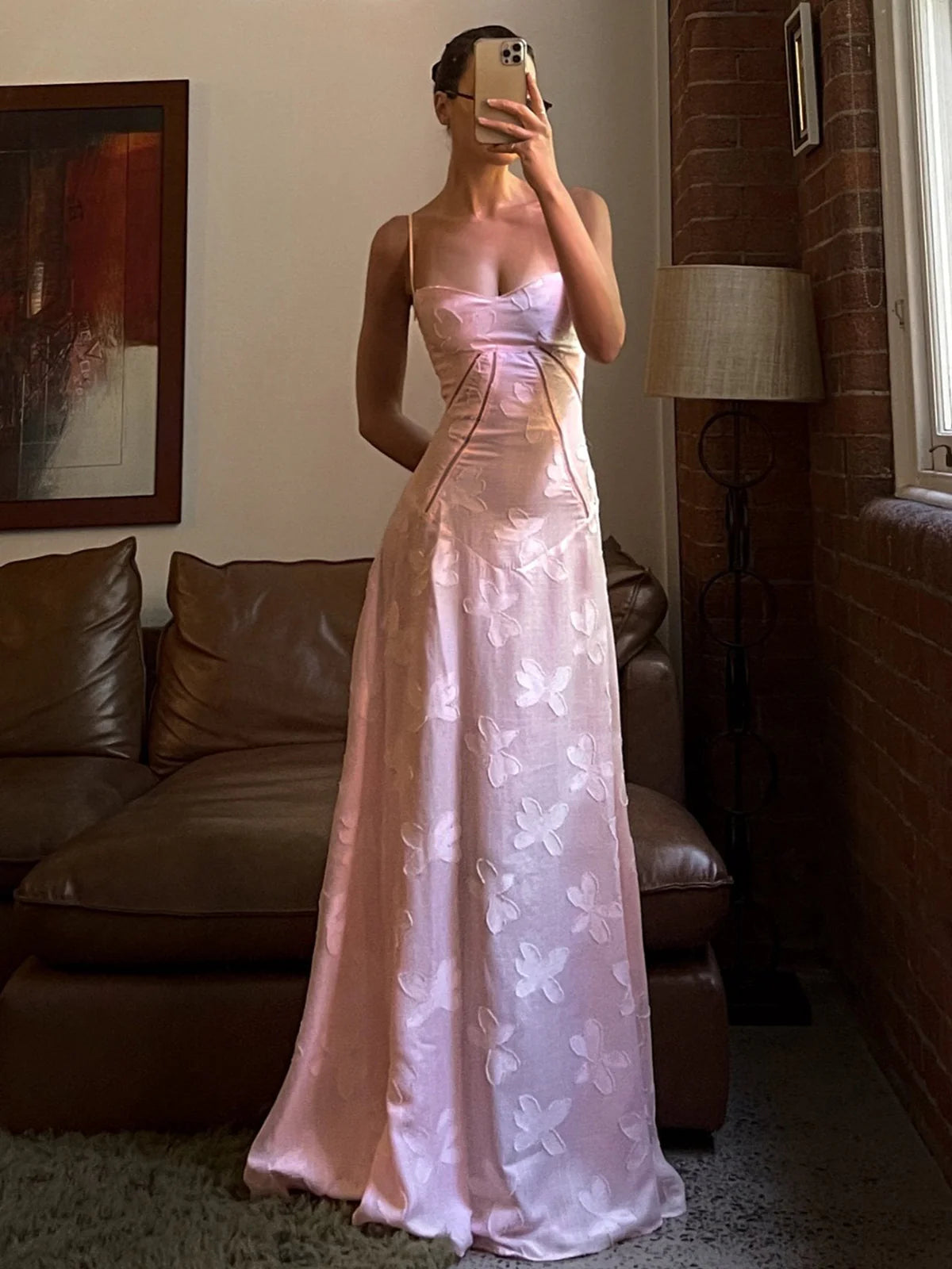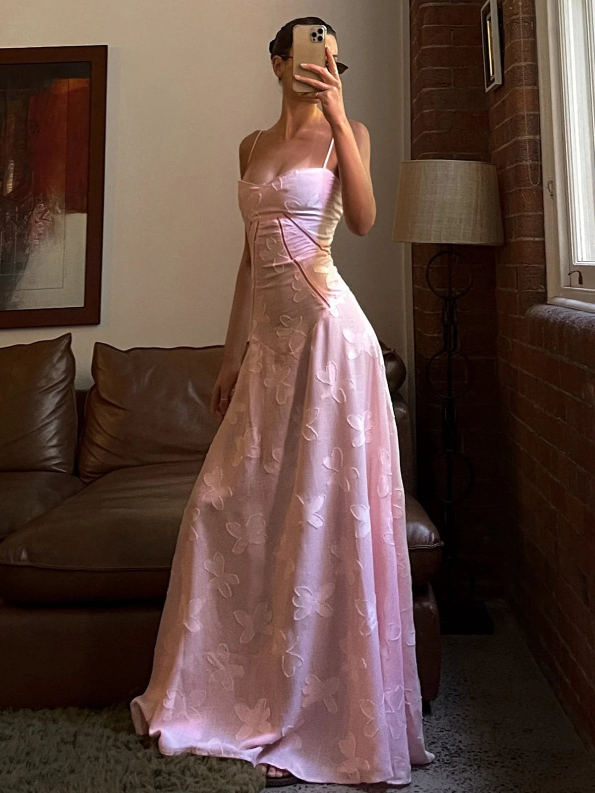 Rosa Spaghettiträger A-Linie Langes Partykleid Hochzeitsgastkleid Geburtstagsoutfits, D525