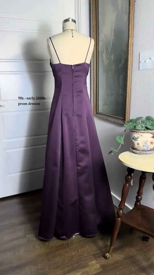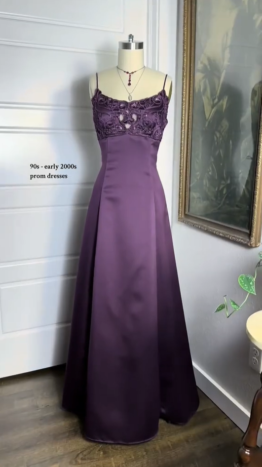 Lila Träger A-Linie Perlenbesetztes Satin Langes Partykleid Vintage Abendkleid, D490
