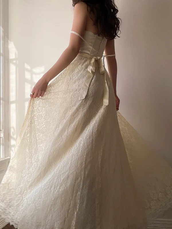 Retro Trägerloses A-Linien-Spitzen-Lang-Partykleid Geburtstagskleid Vintage-Kleid, D483