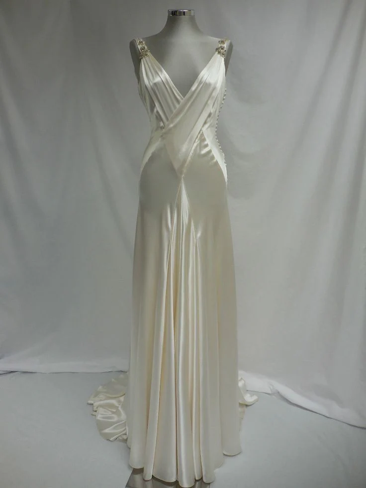 Retro V-Ausschnitt Träger A-Linie Satin Langes Partykleid Vintage Brautkleid, D788