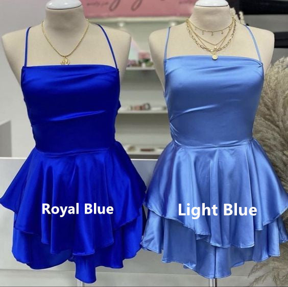 Königsblaue Träger A-Linie Satin Schlichtes Homecoming-Kleid Mini Geburtstags-Outfits, D162