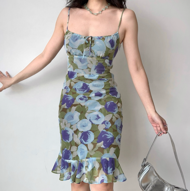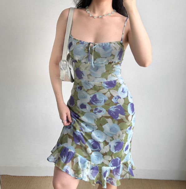 Seaside Spaghettiträger Schnürung Print Blumen Rüschen Teenager Mädchen Frauen Sommer Date Kleid Urlaubskleid D2186