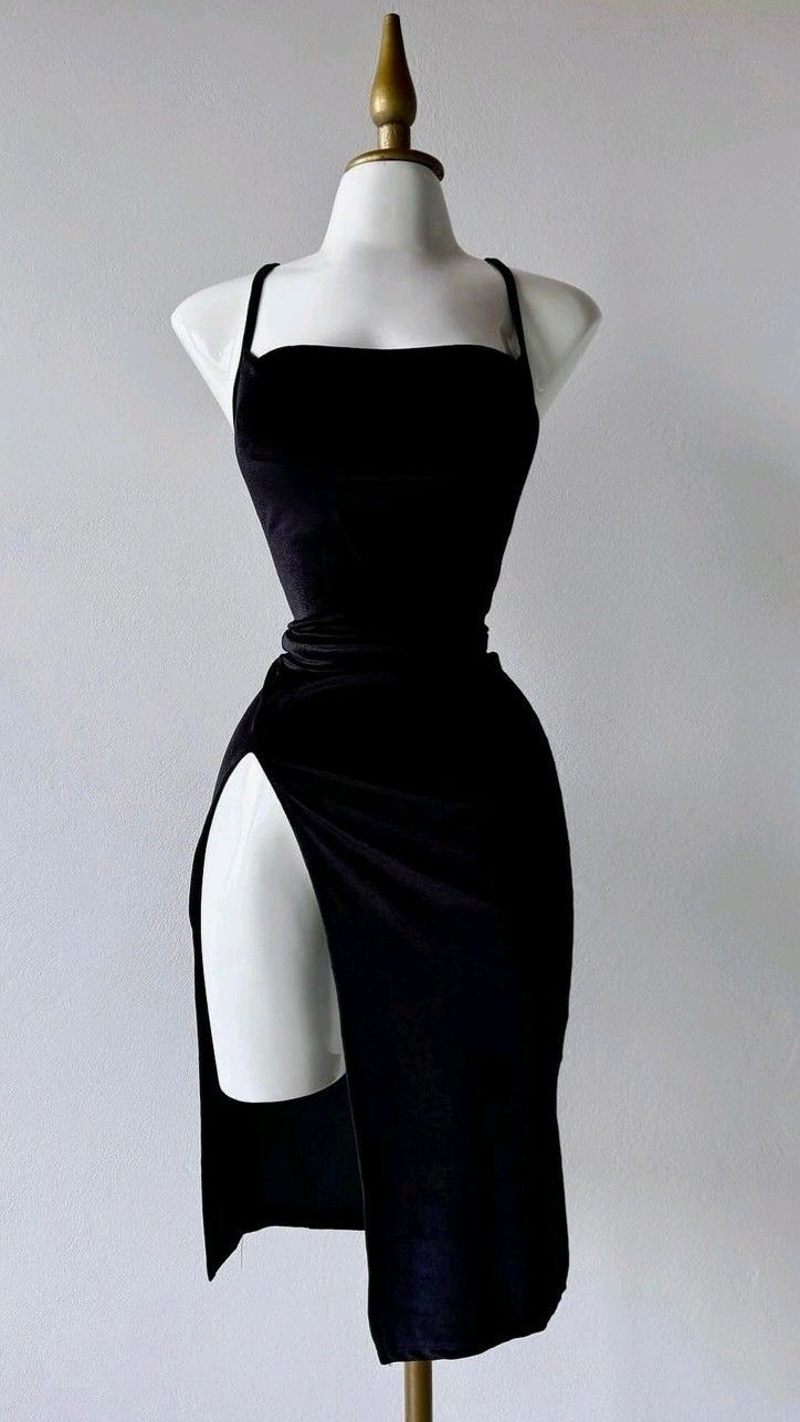 Sexy schwarze Träger Split Samt Midi Länge Partykleider Cocktailkleider, D1220