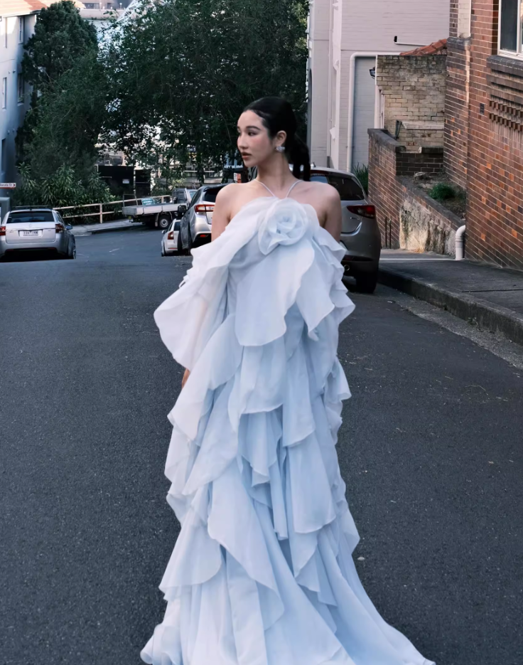 Einfaches, modisches Neckholder-Kleid mit 3D-Blumen-Design, A-Linie, Tüll, gestuftes Partykleid für Damen, D1412