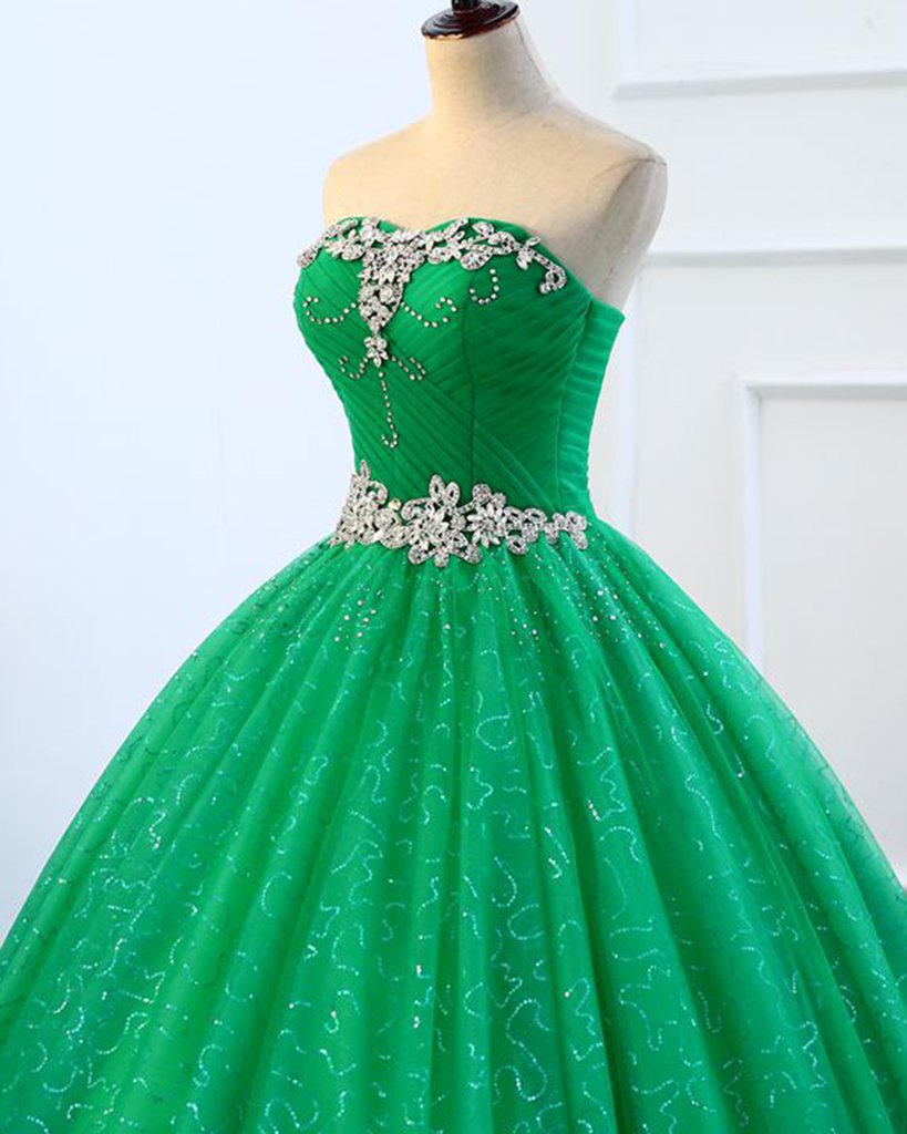 Trägerloses, grünes, langes A-Linien-Ballkleid aus Tüll mit Pailletten und Perlen, formelles Kleid M5445