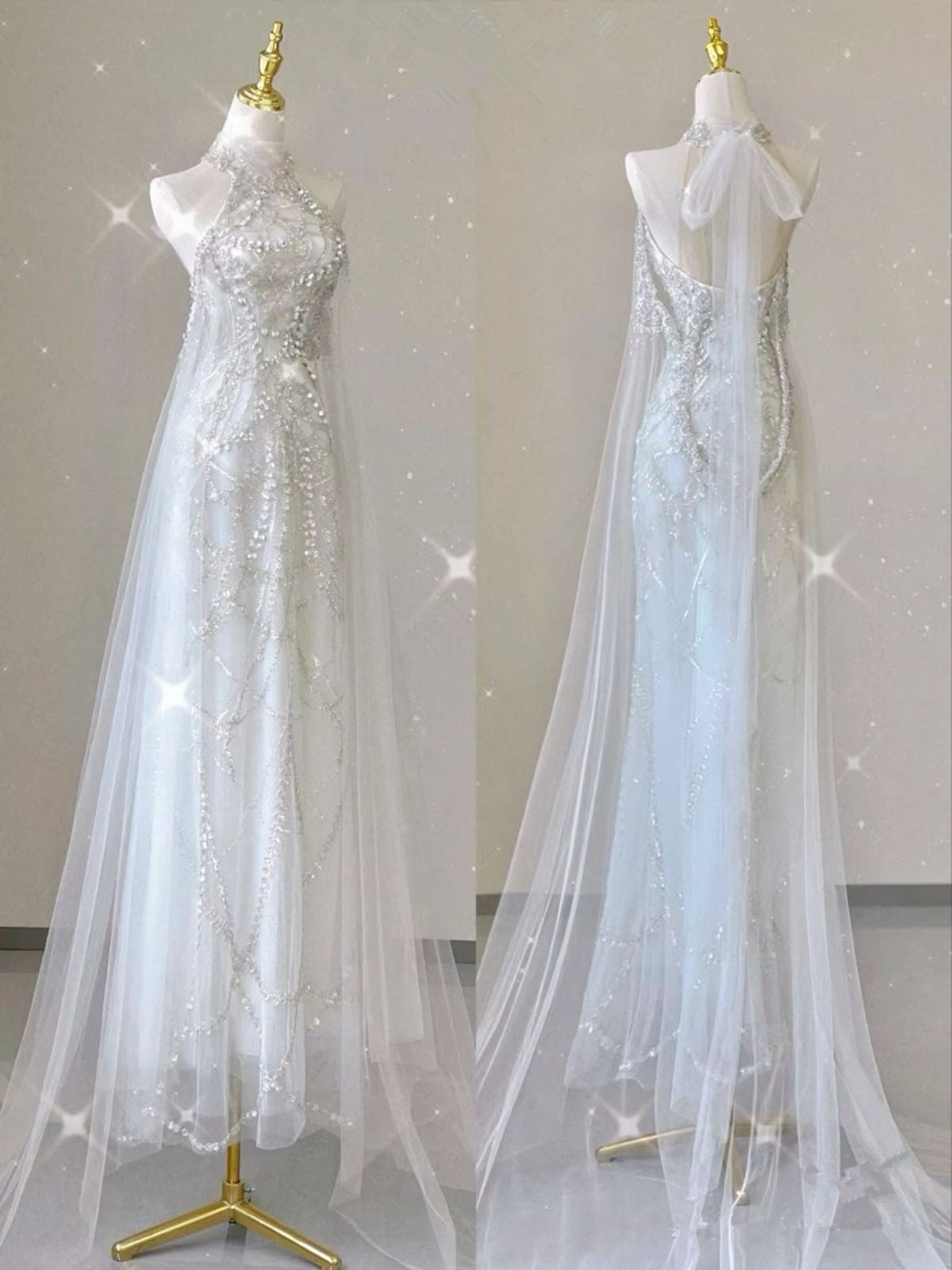 Atemberaubendes Neckholder-A-Linien-Tüll-Abendkleid, langes Partykleid, Brautkleid, D239