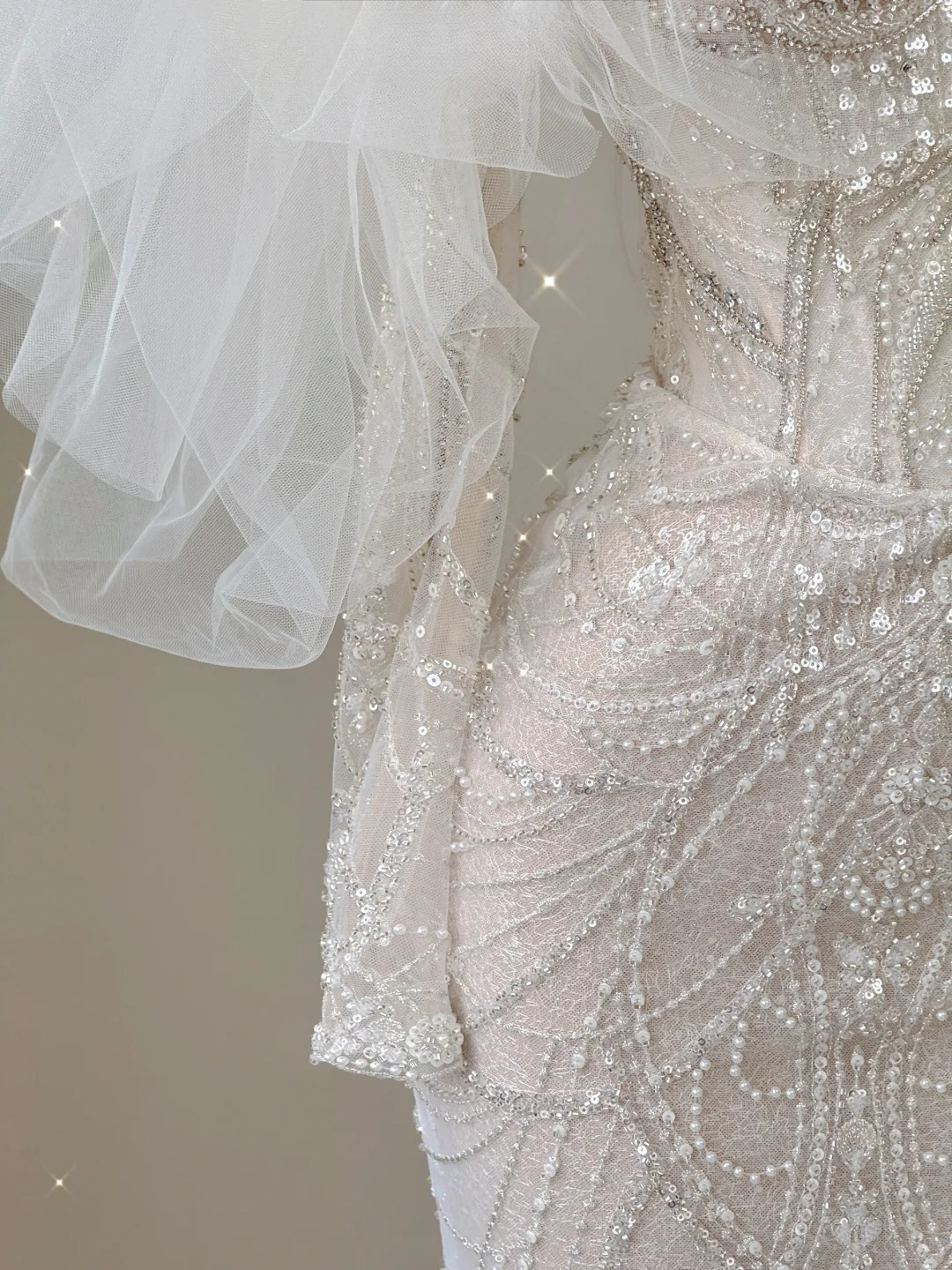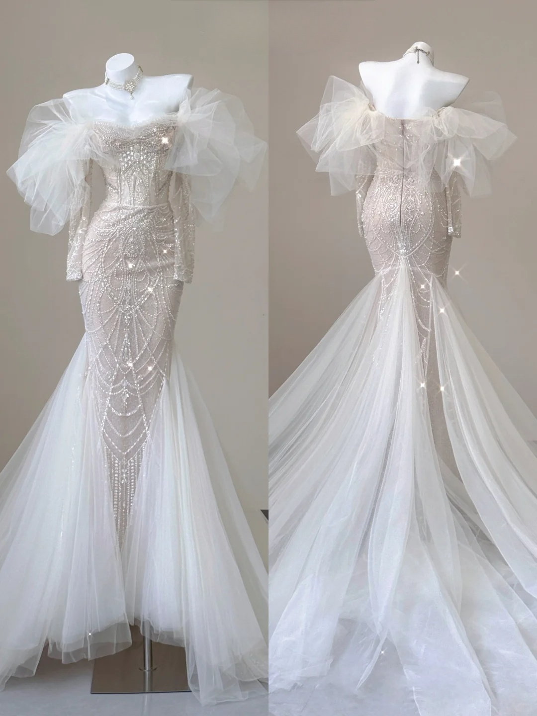 Atemberaubendes schulterfreies, lange Ärmel, Perlenbesatz, Meerjungfrau-Brautkleid, Abendkleid, D469