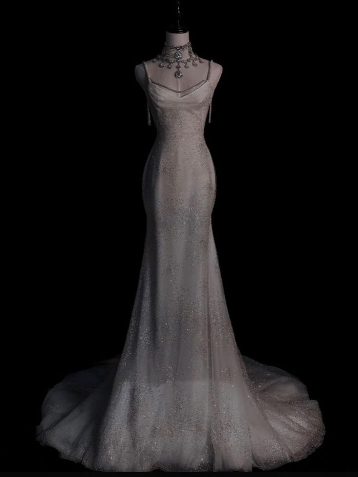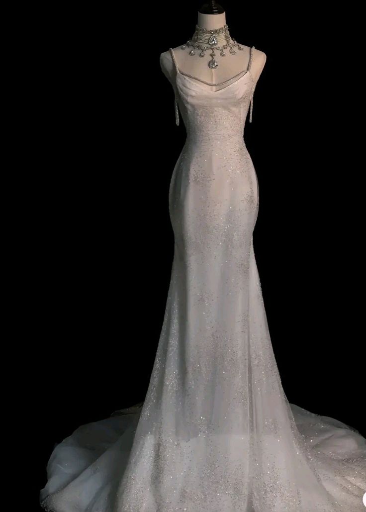 Atemberaubendes weißes rückenfreies Meerjungfrau-Brautkleid im langen, glänzenden Partykleid, D444