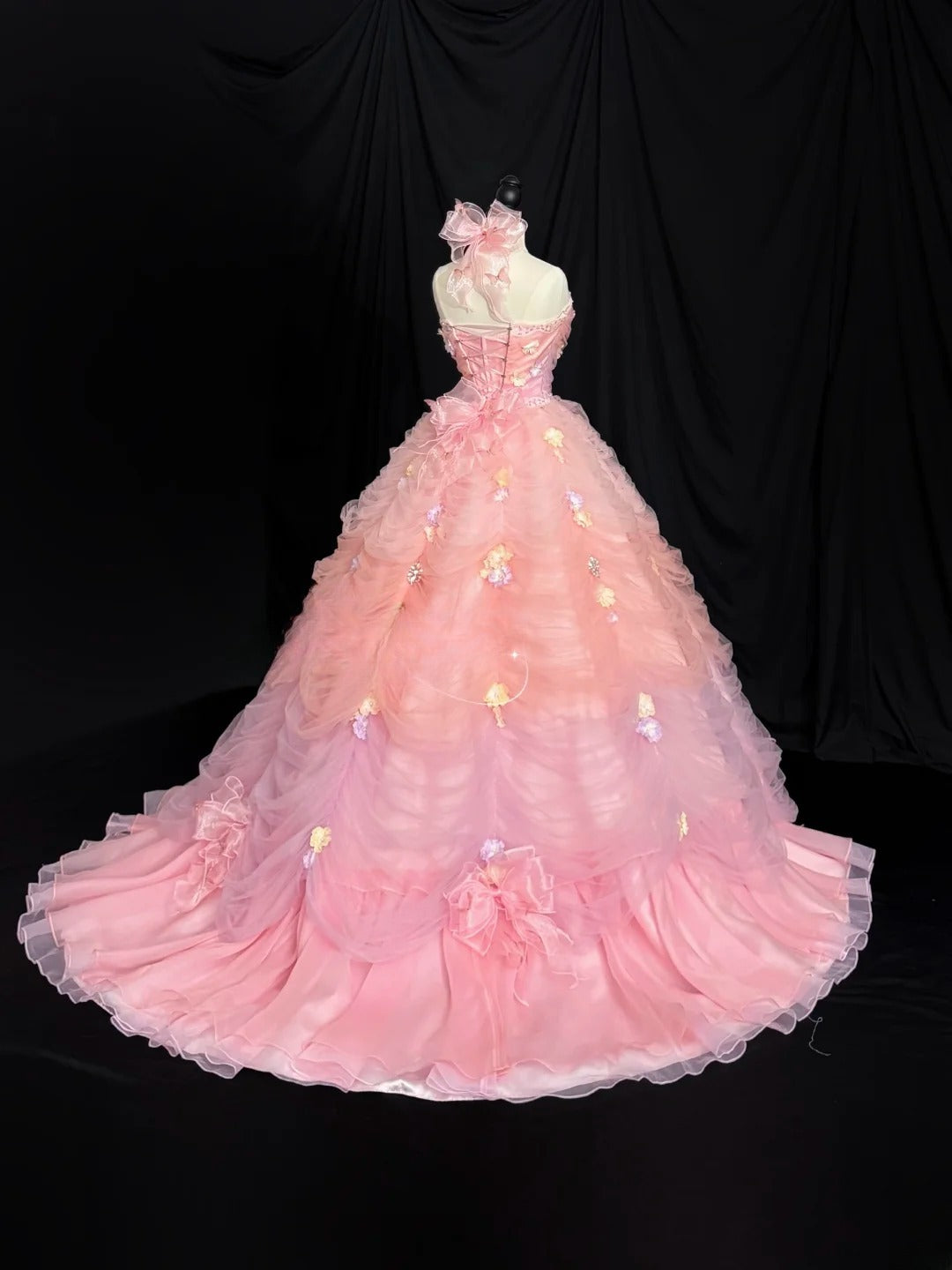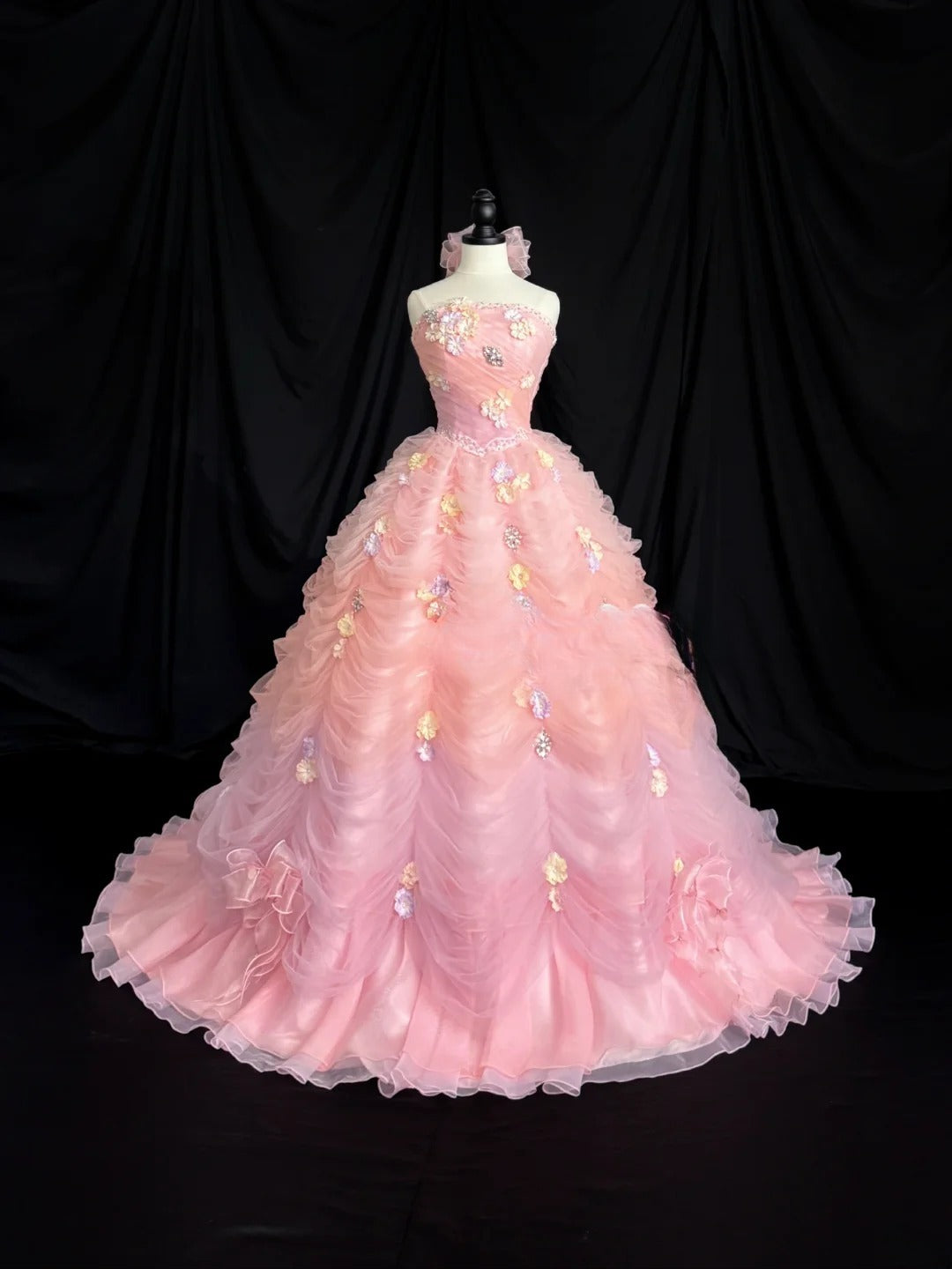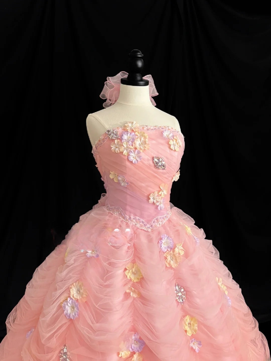 Süßes Ballkleid Trägerlos Blumen Tüll Plissee Ballkleid Abendkleid Quinceanera Kleid D2839