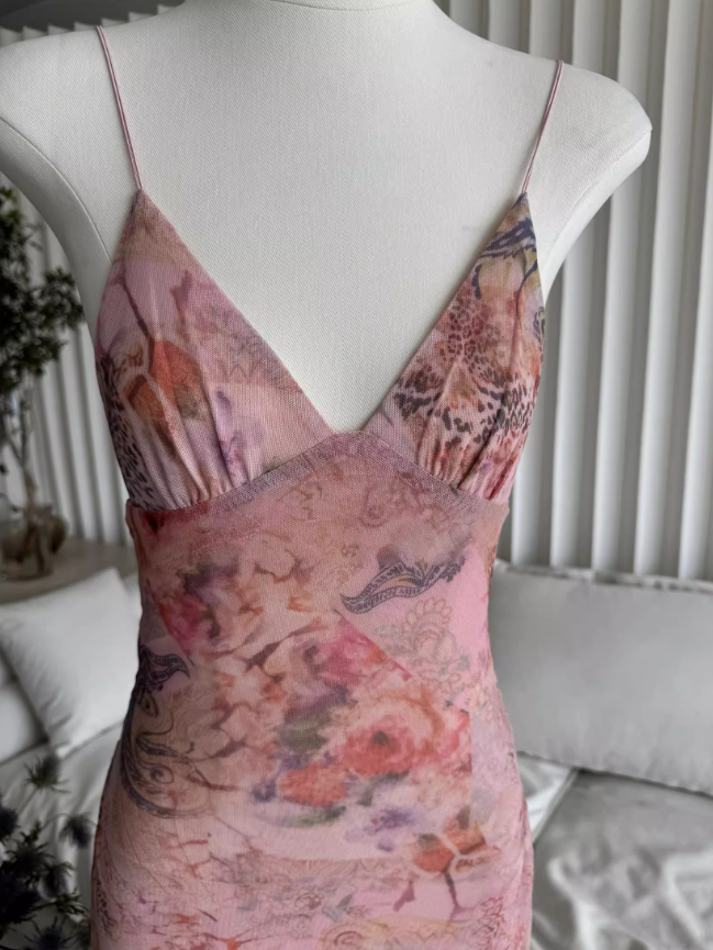 Süßes Spaghettiträger-V-Ausschnitt-Rückenfreies Design Blumendruck A-Linie Damen Partykleid, D1399