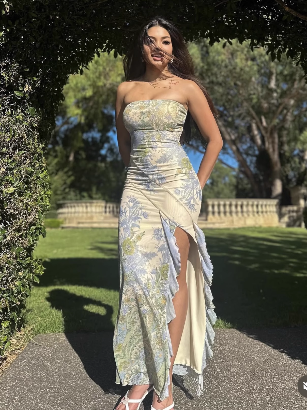 Süßes trägerloses A-Linien-Partykleid mit Blumenmuster und unregelmäßigem Saum, D1400