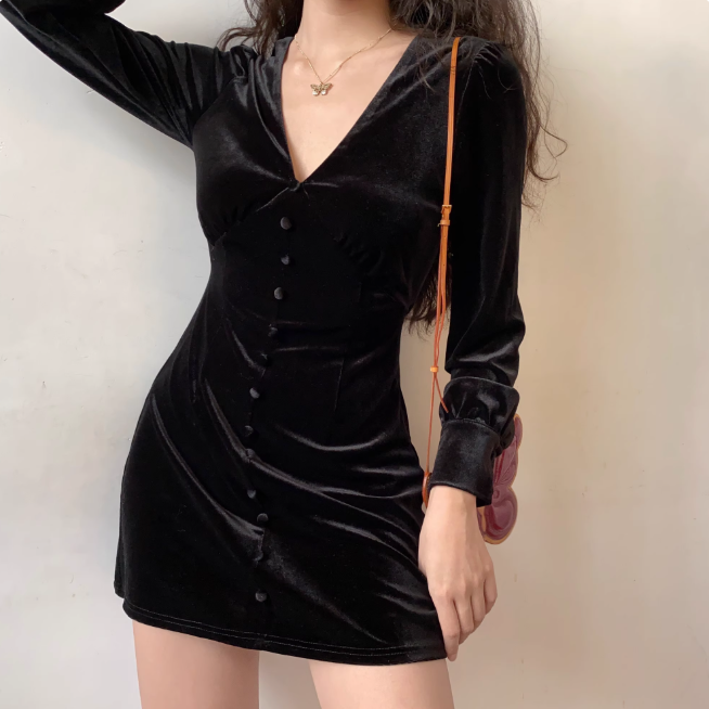Vielseitiger schwarzer V-Ausschnitt, lange Ärmel, kurzer Rock, Damen, Teenager, Mädchen, Date-Kleid D2205