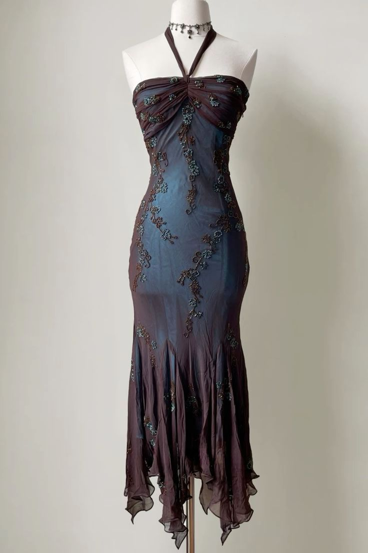Vintage Neckholder Meerjungfrau Perlen Chiffon Lange Abend Party Kleider, D1022
