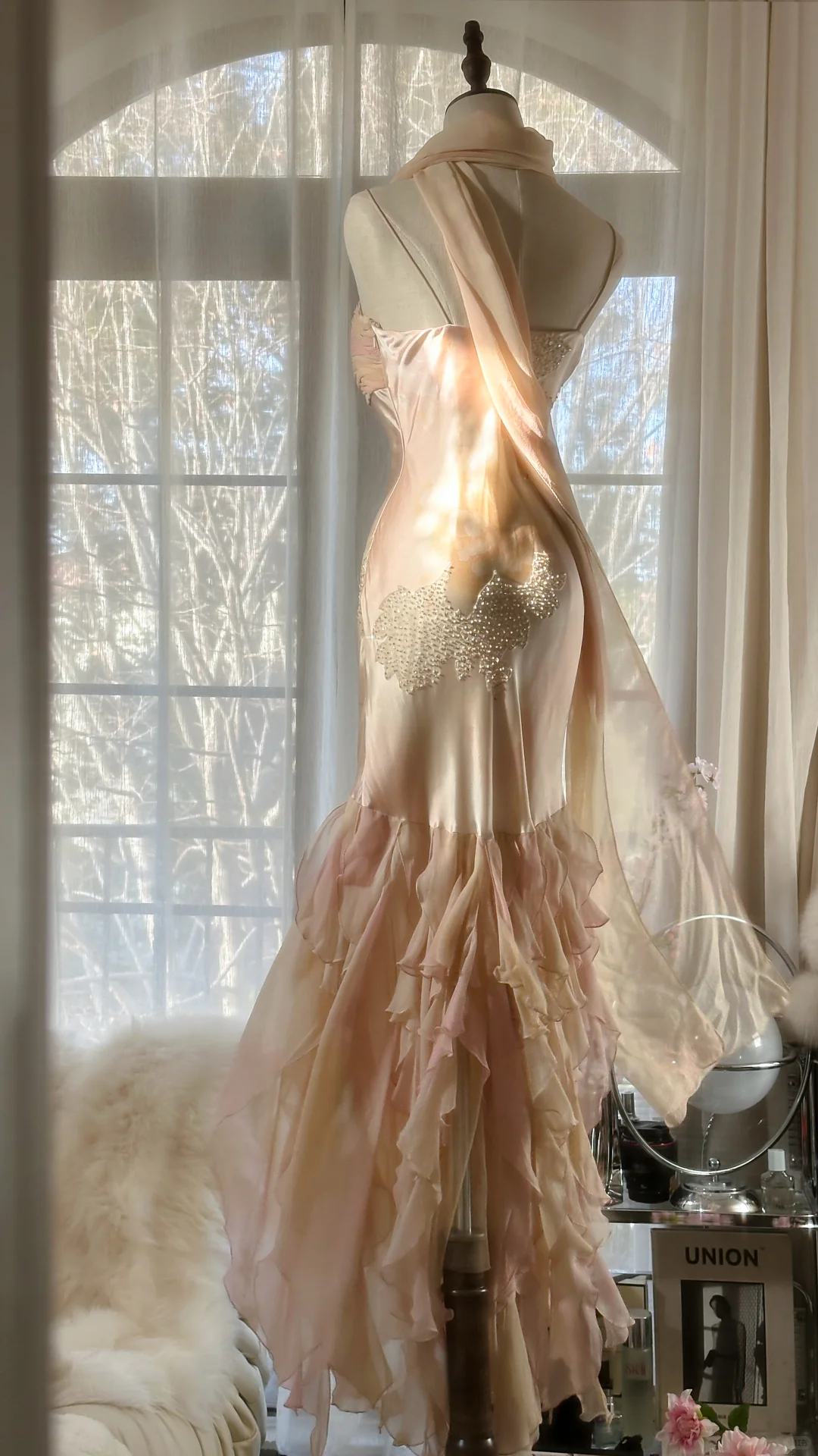 Vintage Meerjungfrau Perlen Blumenmuster Romantisches Chiffon Abendkleid Ballkleid D1512